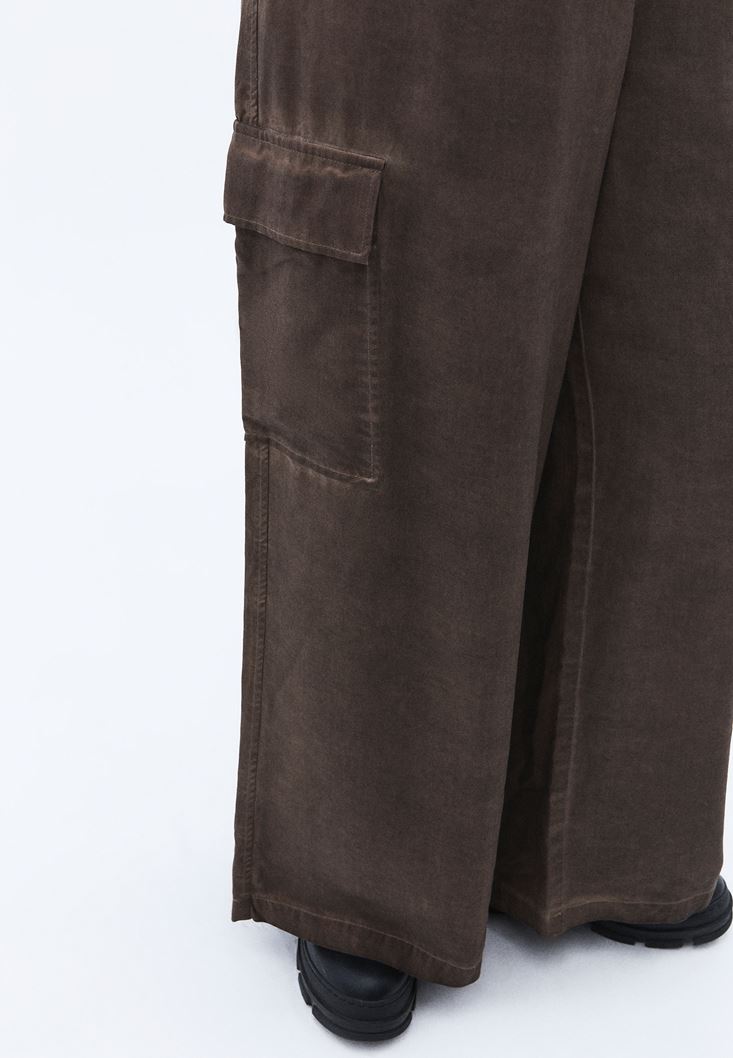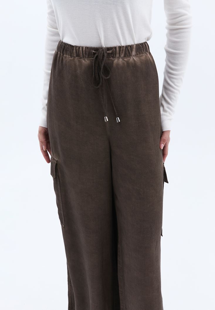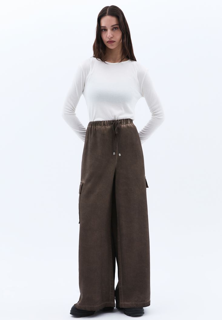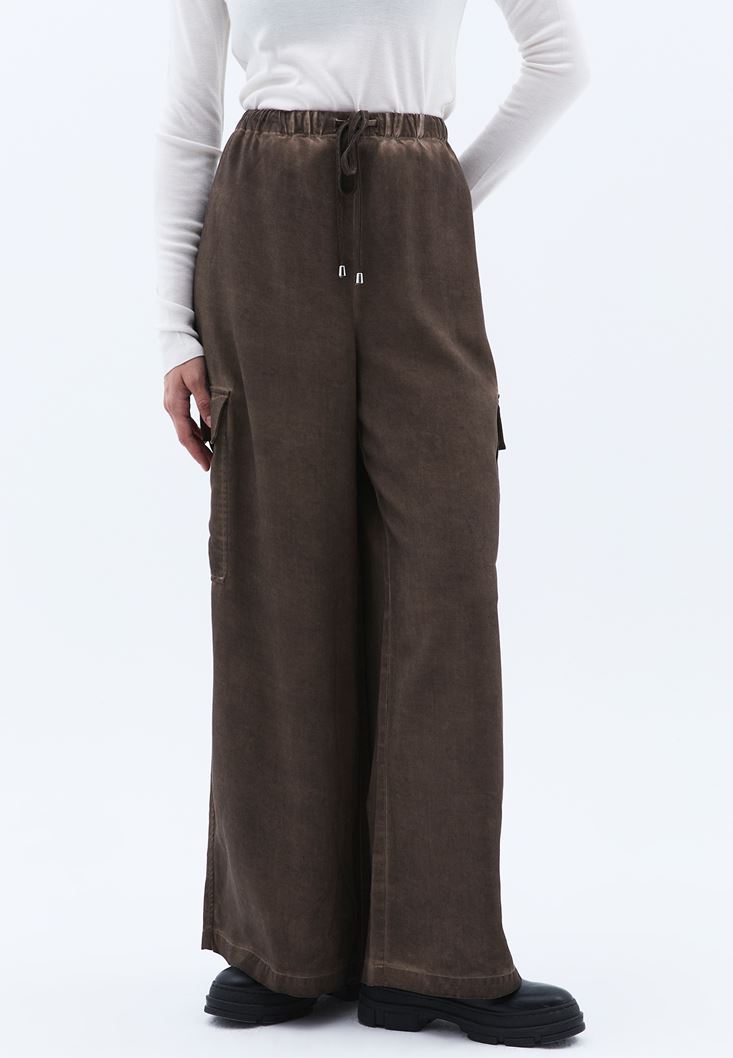%100 Tencel(Lyocell) içerikli geri dönüştürülebilir doku, nefes alabilen antibakteriyel kumaş, orta bel, kargo cep detaylı, bedenden uzak rahat fit, bol paça, beli lastikli ve bağcıklı, yıkamalı görünüm.