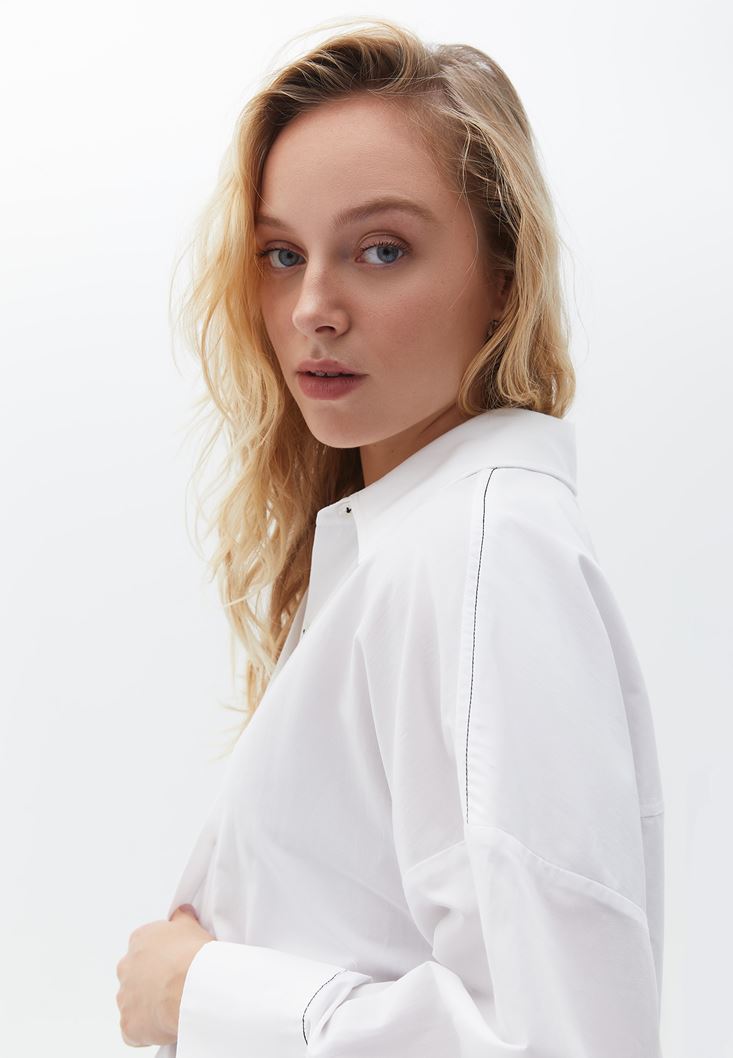 • Bayan Beyaz Oversize Baskılı Gömlek