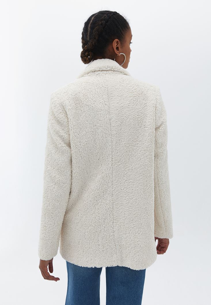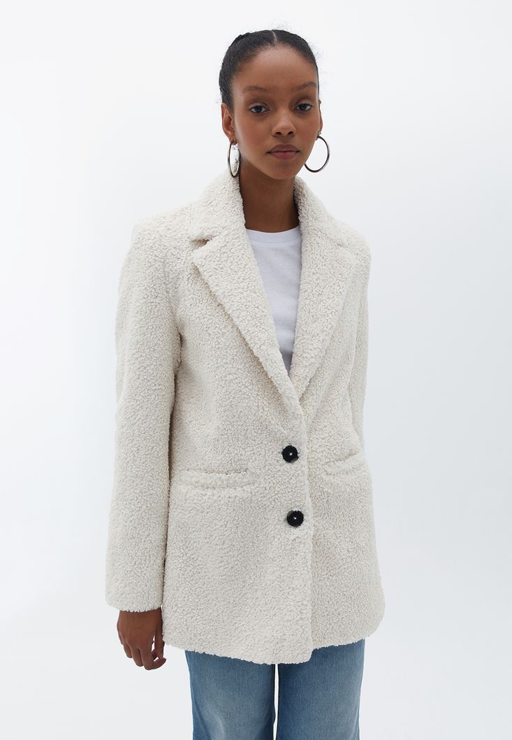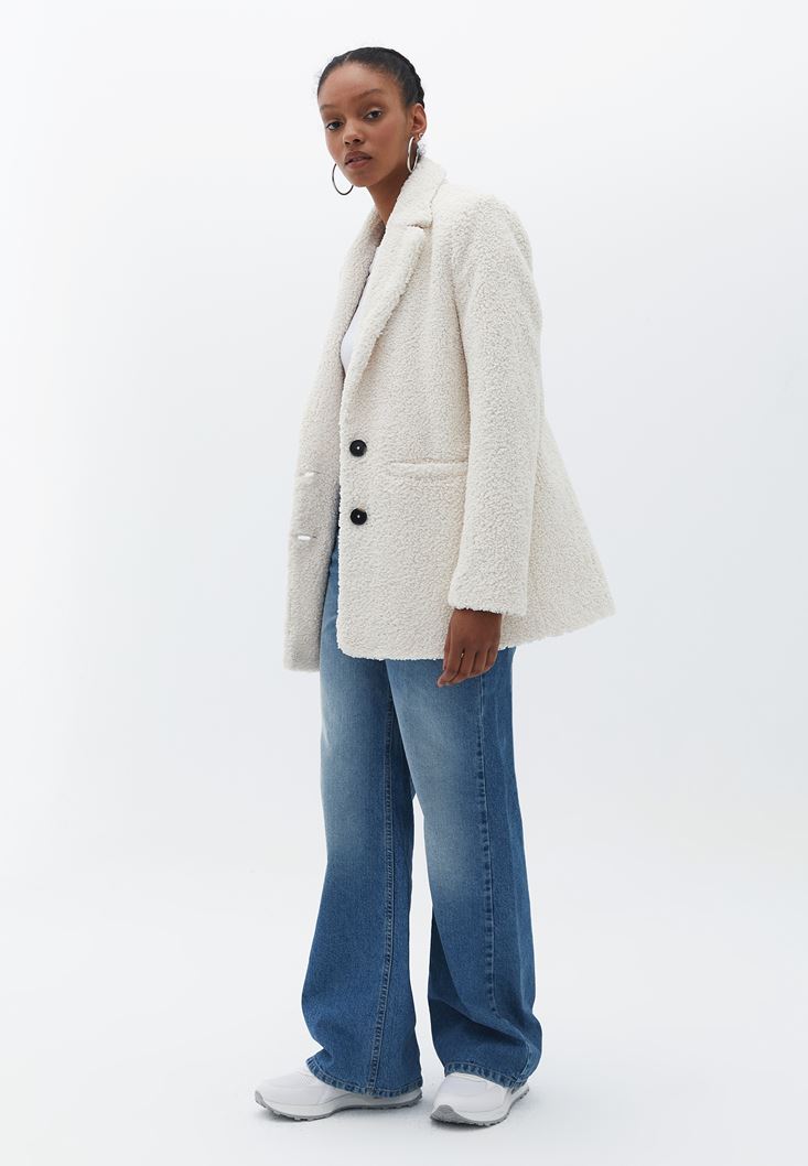 Özel yumuşak buklet doku, bedenden uzak oversize fit, uzun kollu, düğme kapamalı, iki cepli, omuzları vatkalı, içi astarlı.