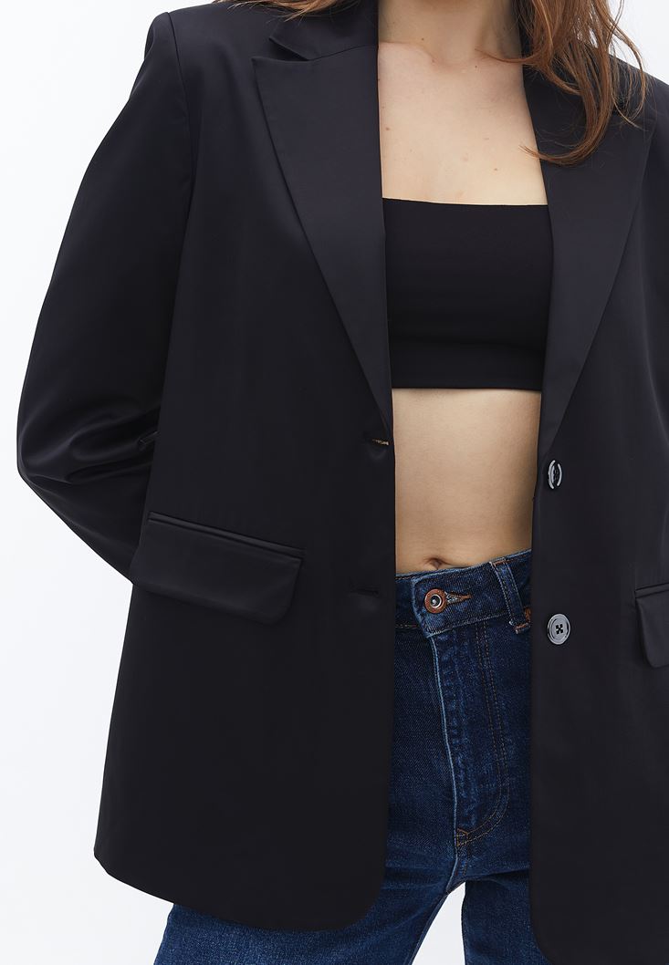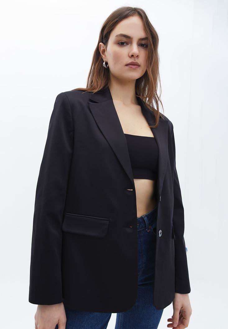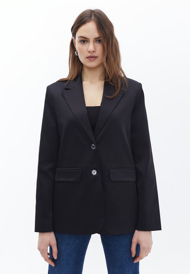 Pamuk karışımlı doku, bedenden uzak oversize fit, kapaklı iki cep, içi astarlı.