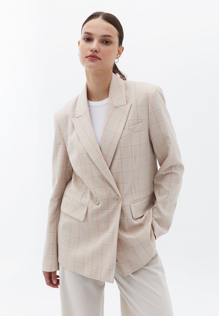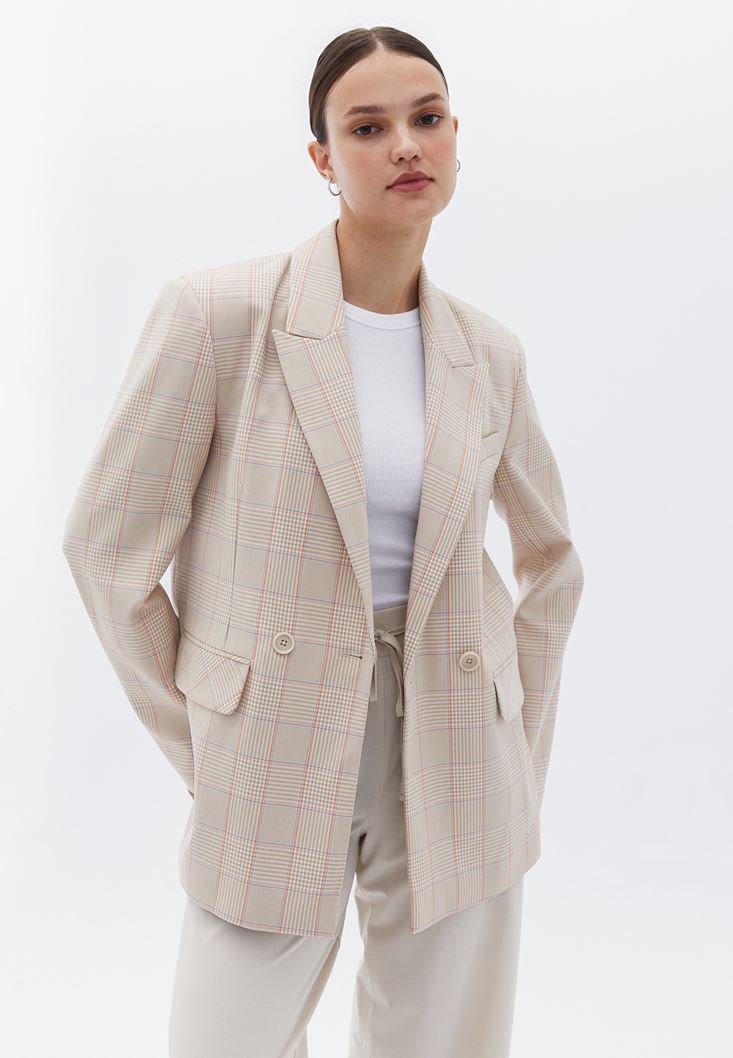 Viskon karışımlı doku, bedenden uzak oversize fit, ekose desenli, çift düğme kapamalı, iki cepli.