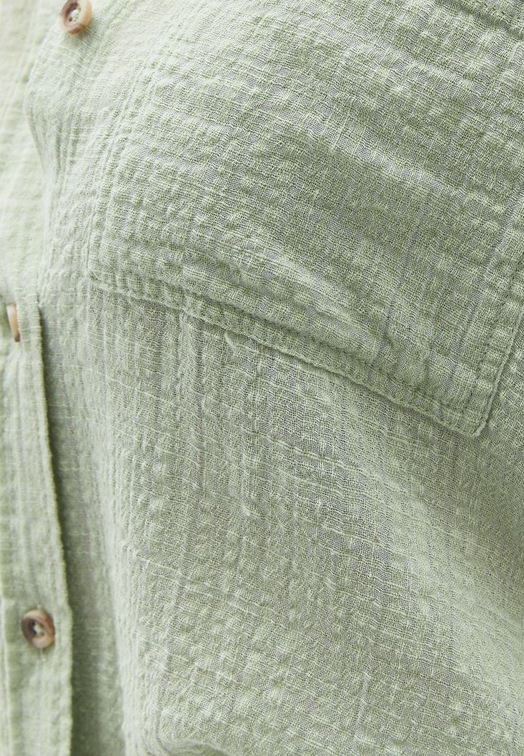 Pamuk ve viskon karışımlı özel doku, bedenden uzak oversize fit, tek cepli, önü kısa arkası uzun asimetrik kesim, uzun kollu.