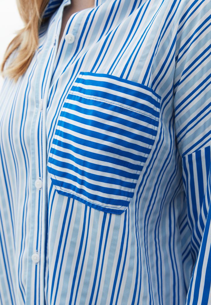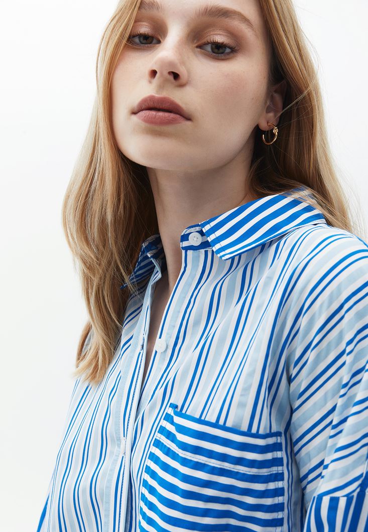 Viskon karışımlı doku, çizgi desenli, bedenden uzak oversize fit, uzun kollu, tek cepli, önü kısa arkası uzun asimetrik kesim.