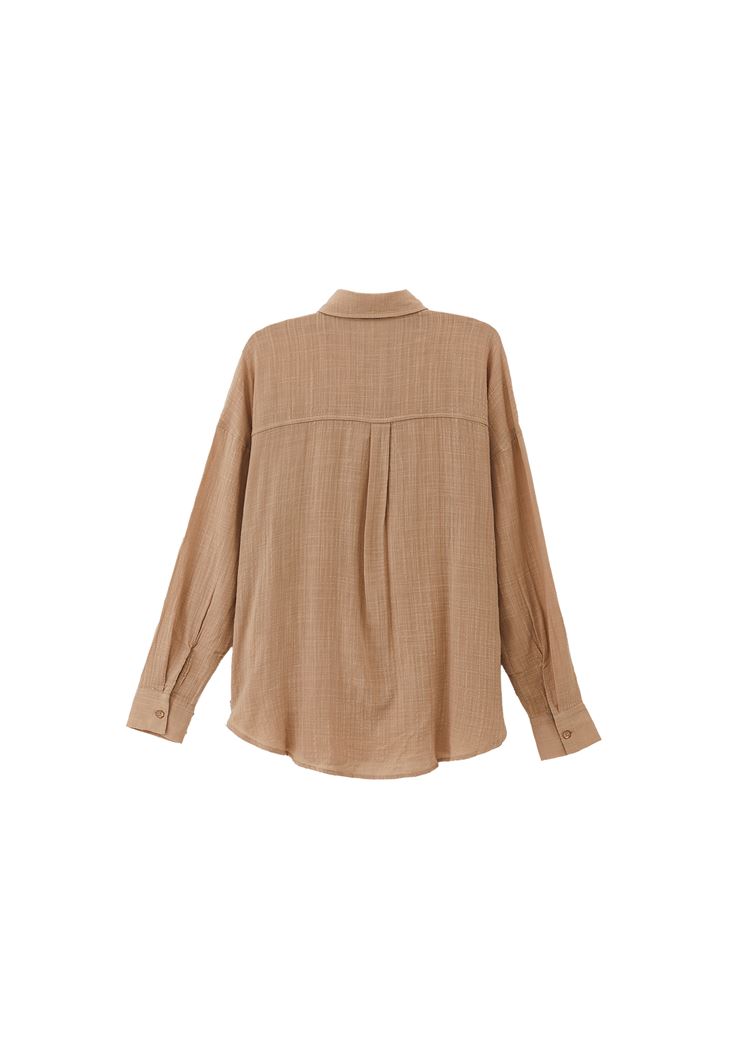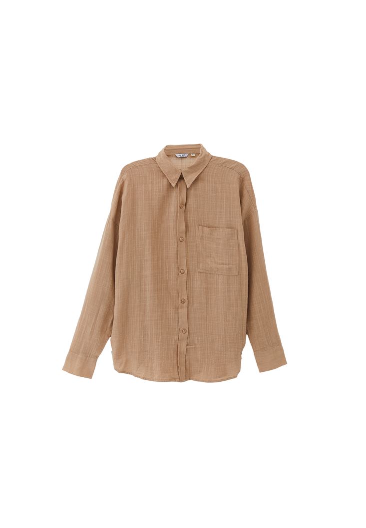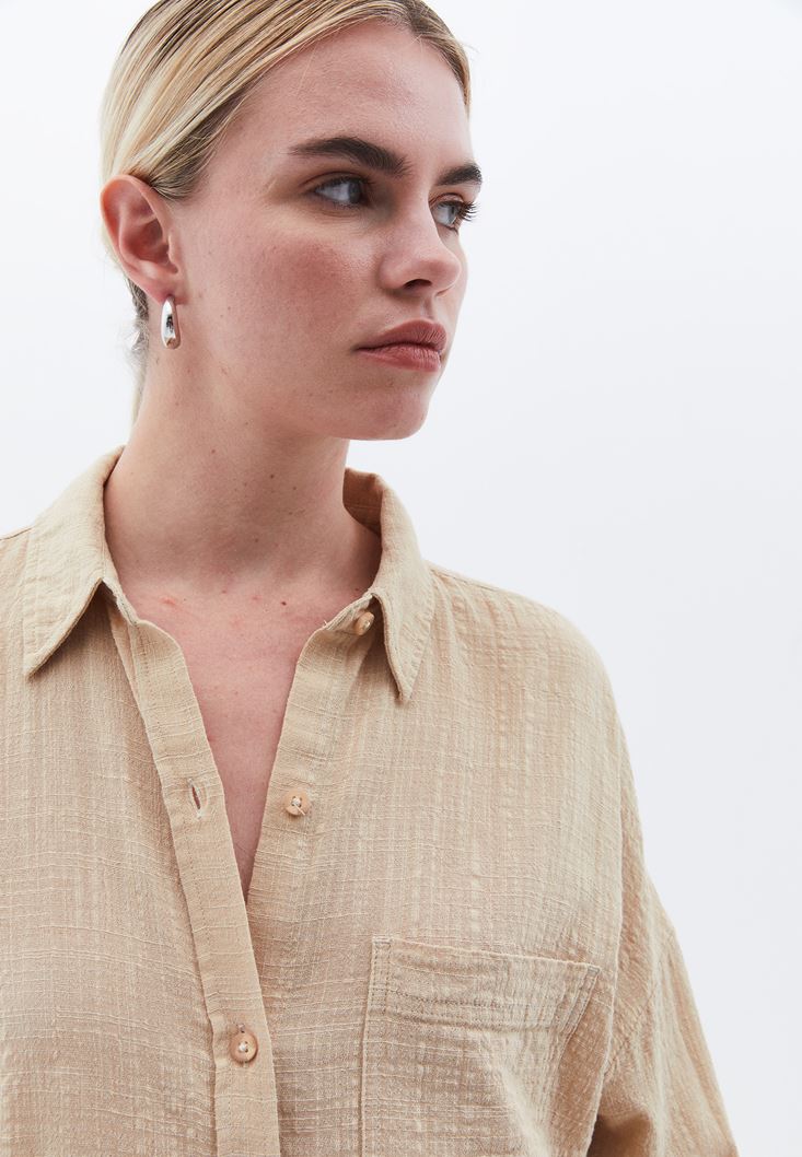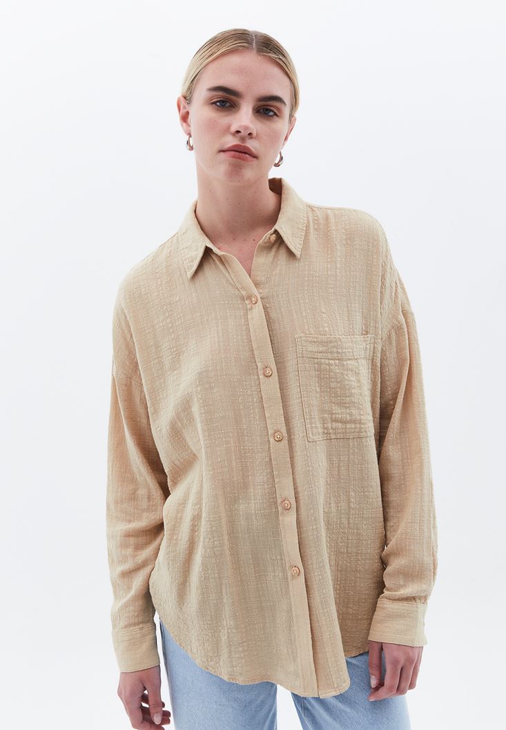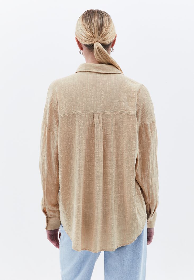 Pamuk ve viskon karışımlı özel doku, bedenden uzak oversize fit, tek cepli, önü kısa arkası uzun asimetrik kesim, uzun kollu.