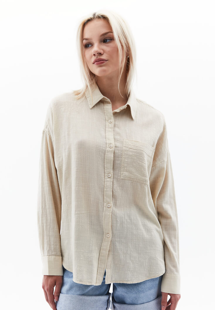 OXXO’nun imzası haline gelen "oversize" (geniş) kalıbı, silüetinize çabasız bir görünüm kazandırırken hareket özgürlüğünüzü en üst seviyeye taşır. Tasarımın merkezindeki karakteristik cep detayları, gömleğin minimal formuna modern bir derinlik ve fonksiyonellik katar. Pamuğun saflığı ile viskonun ipeksi dokusunun birleşimi, bu tasarımı hem tek başına hem de şık bir ceket gibi katmanlı kombinlerin vazgeçilmezi kılıyor.