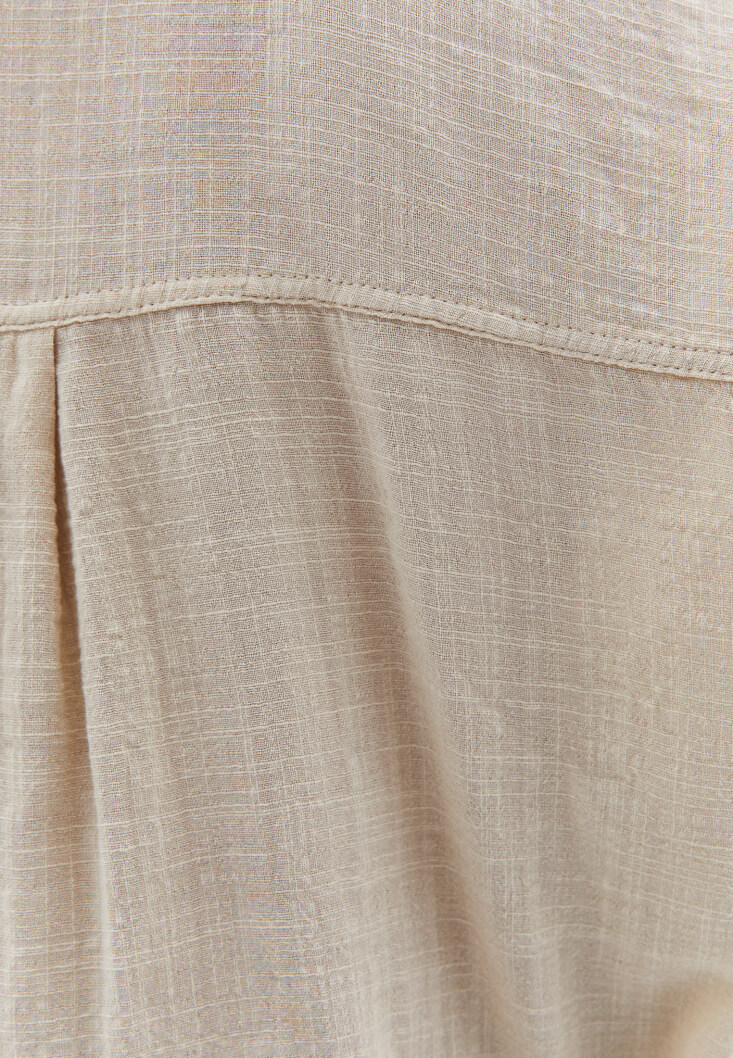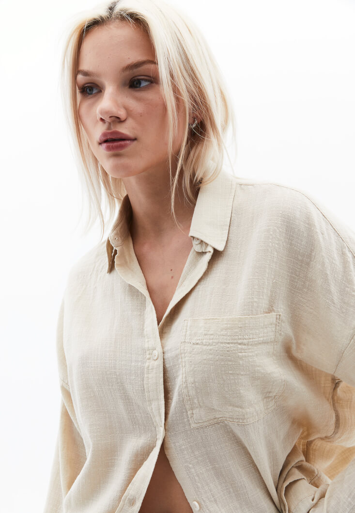 Pamuk ve viskon karışımlı özel doku, bedenden uzak oversize fit, önü kısa arkası uzun asimetrik kesim, tek cepli, uzun kollu.