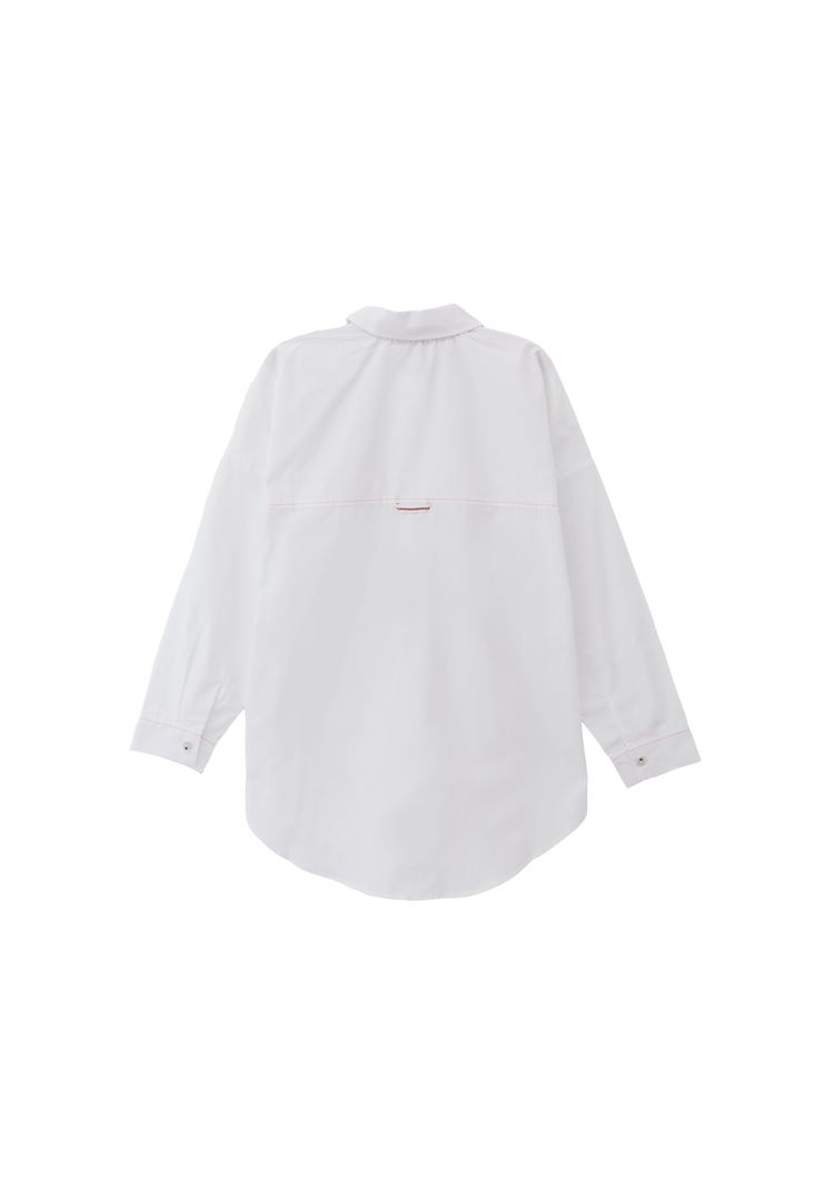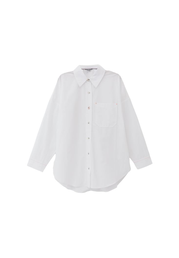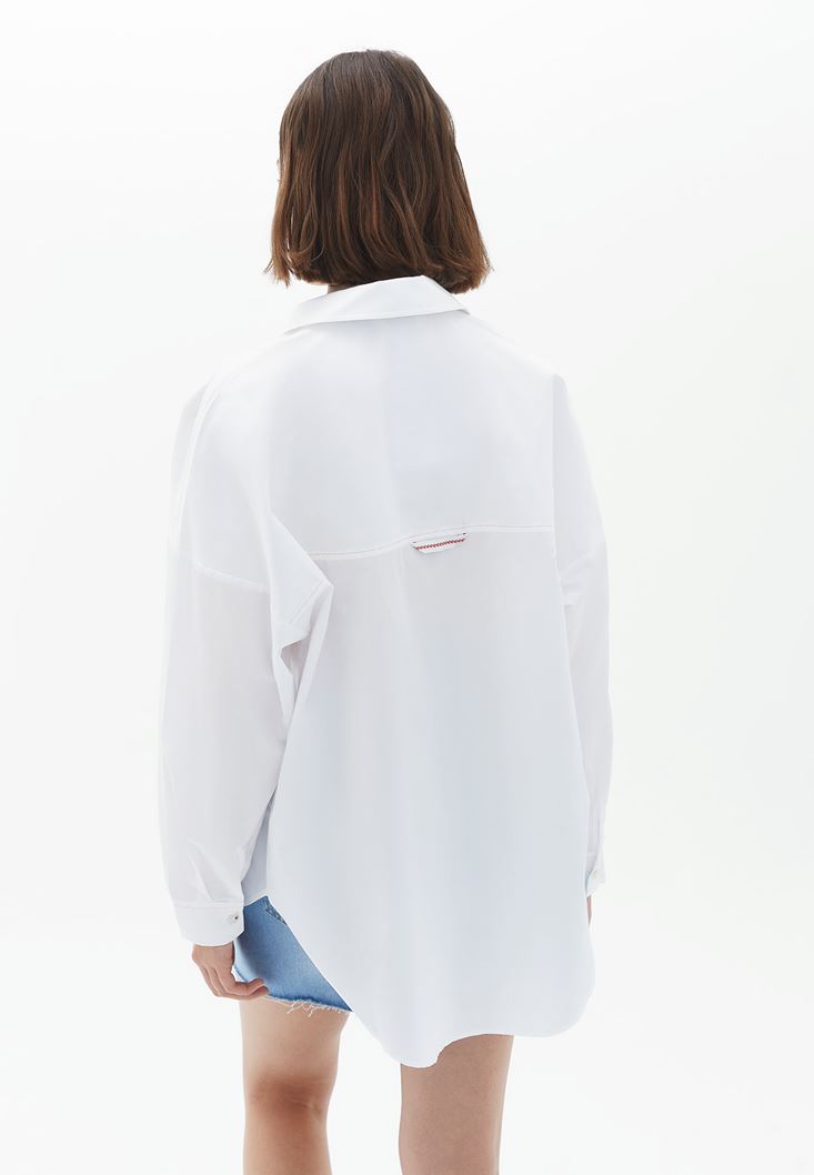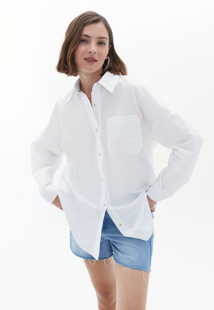 Pamuk karışımlı özel doku, bedenden uzak oversize fit, uzun kollu, önü kısa arkası uzun asimetrik kesim, ön kısmı tek cepli.