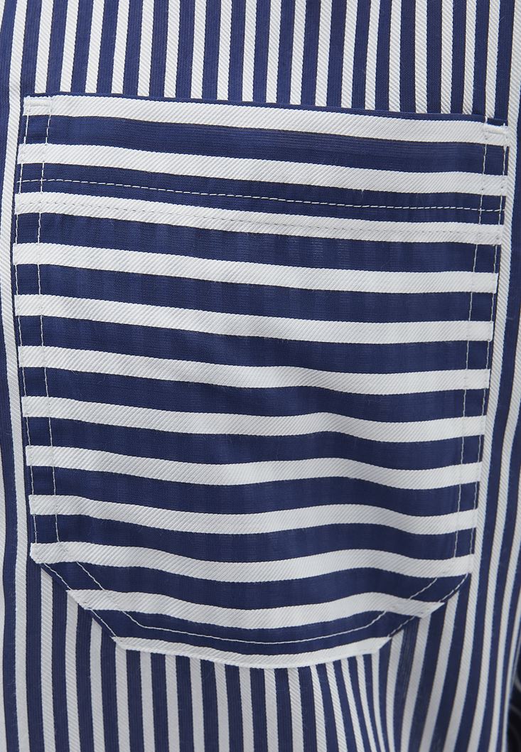 Viskon içerikli özel doku, çizgi desenli, ön kısmı tek cepli, bedenden uzak oversize fit, uzun kollu, önü kısa arkası uzun asimetrik kesim.