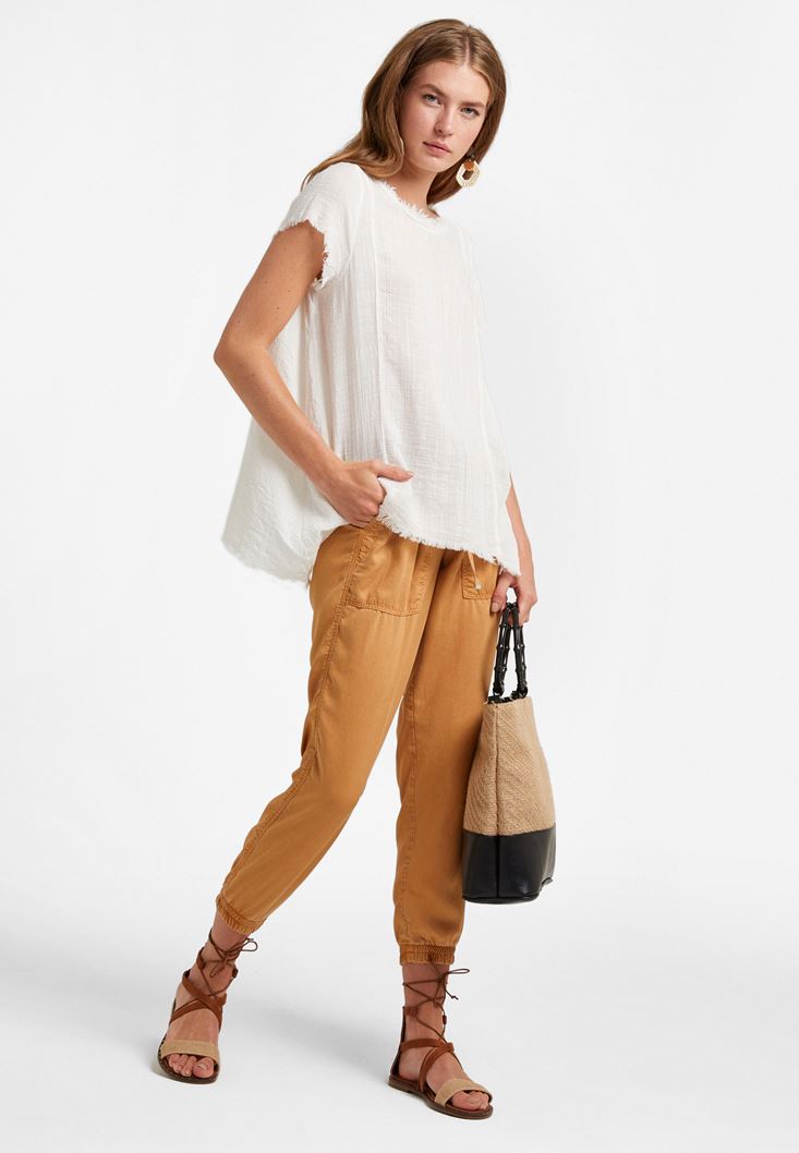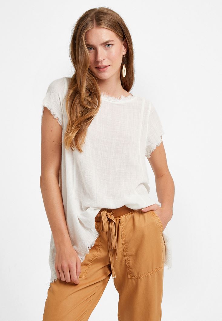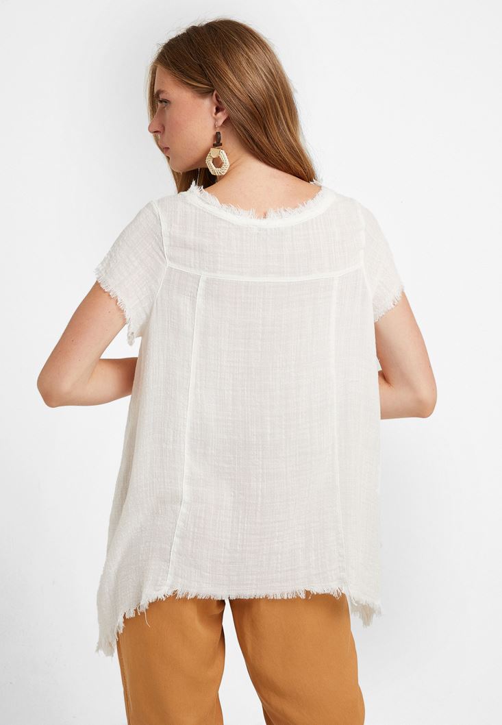 Oversize Dokuma Bluz modeli dökümlü kesimi, çok özel ve şık görünümlü dokusu, zarif detayları ve özgün tarzı ile kısa sürede her zaman kullanmaktan keyif alacağınız kadın bluz modelleri arasında yer alacak. Sıfır yaka kesimi ve yakayı ön plana çıkarmak için kullanılan kesik detayları ile salaş görüntüsü ön plana çıkan bluz modelinin kol ve etek uçlarında da kesik detaylar yer alıyor. Bu detaylar sayesinde enerji ve hareket kazanan tasarım etnik, bohem, günlük, casual ya da ofis kombinlerinde rahatlıkla tercih edebileceğiniz kurtarıcı bir parçaya dönüşüyor. kadın bluz modelinin tasarım bütünlüğü etek uçlarındaki asimetrik kesim ile tamamlanıyor. Pamuk ve viskon liflerinin yumuşak dokusu sayesinde konforlu bir kullanım deneyimi sunan oversize dokuma bluz modeli, OXXO’nun dokulardan aldığı ilhamı başarılı bir şekilde yansıtıyor.