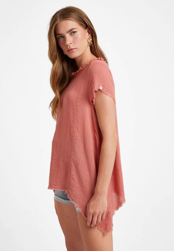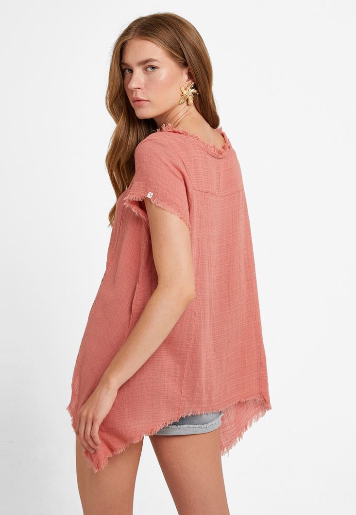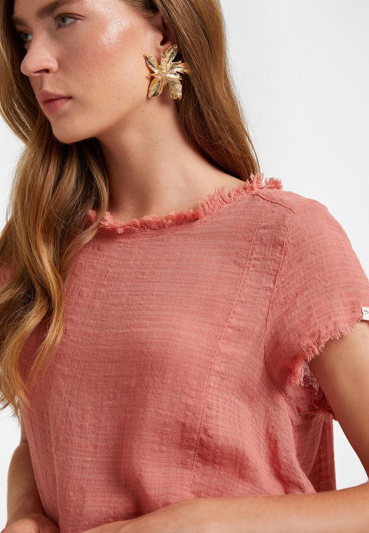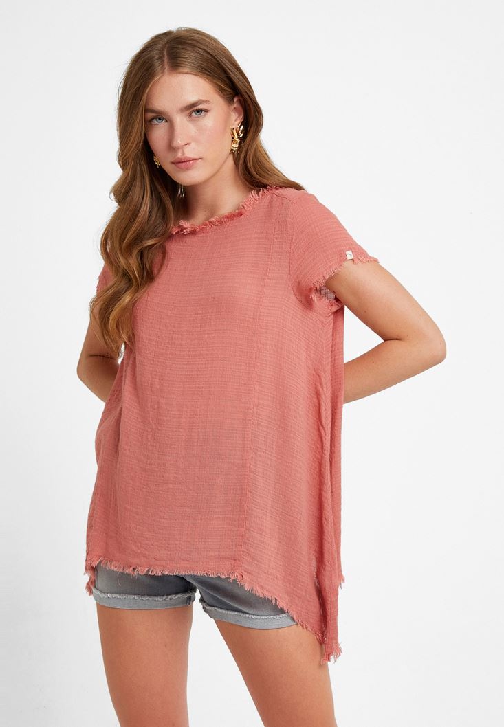 Oversize Dokuma Bluz modeli dökümlü kesimi, çok özel ve şık görünümlü dokusu, zarif detayları ve özgün tarzı ile kısa sürede her zaman kullanmaktan keyif alacağınız kadın bluz modelleri arasında yer alacak. Sıfır yaka kesimi ve yakayı ön plana çıkarmak için kullanılan kesik detayları ile salaş görüntüsü ön plana çıkan bluz modelinin kol ve etek uçlarında da kesik detaylar yer alıyor. Bu detaylar sayesinde enerji ve hareket kazanan tasarım etnik, bohem, günlük, casual ya da ofis kombinlerinde rahatlıkla tercih edebileceğiniz kurtarıcı bir parçaya dönüşüyor. kadın bluz modelinin tasarım bütünlüğü etek uçlarındaki asimetrik kesim ile tamamlanıyor. Pamuk ve viskon liflerinin yumuşak dokusu sayesinde konforlu bir kullanım deneyimi sunan oversize dokuma bluz modeli, OXXO’nun dokulardan aldığı ilhamı başarılı bir şekilde yansıtıyor.