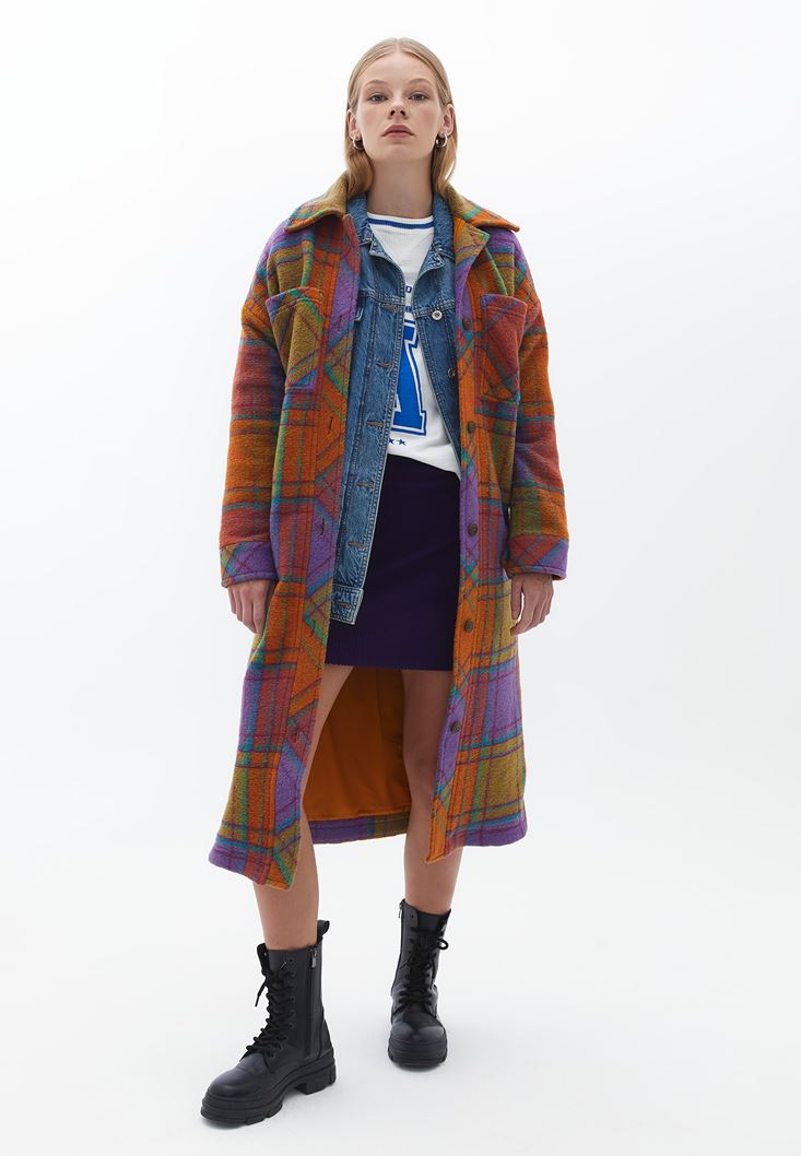 Çok Renkli Oversize Ekoseli Uzun Ceket