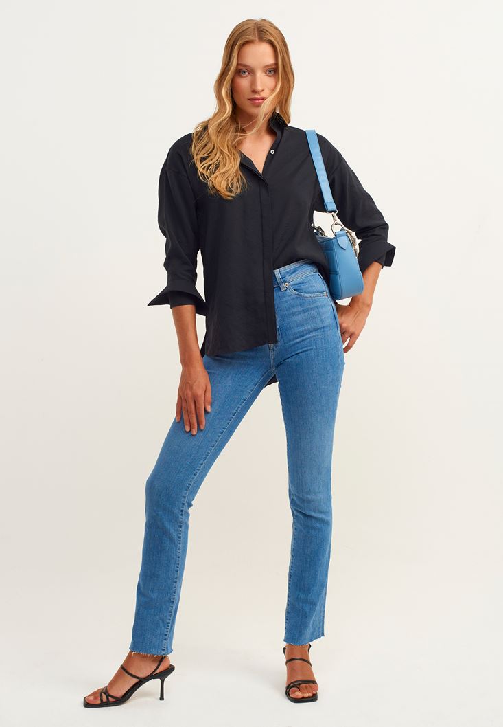 Modal karışımlı özel doku, bedene yakın rahat fit, iki düğmeli geniş manşet tasarımı, önü kısa arkası uzun asimetrik kesim.