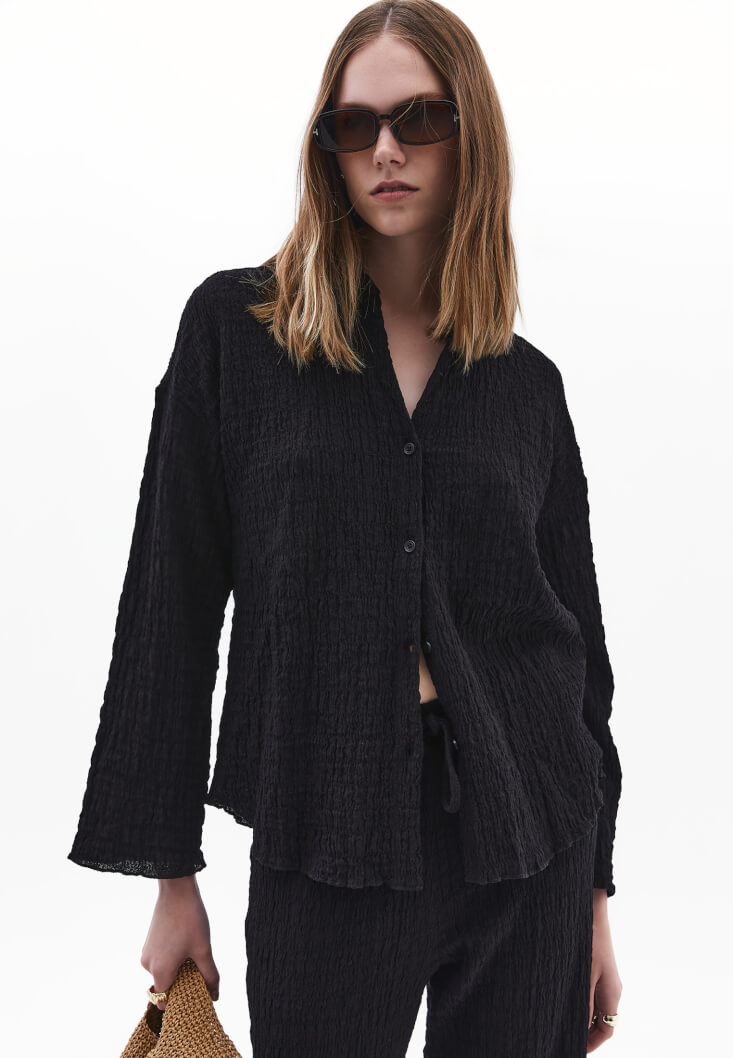 Pamuk karışımlı örme doku, bedenden uzak oversize fit, uzun kollu, düğme kapamalı.