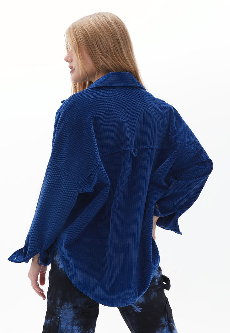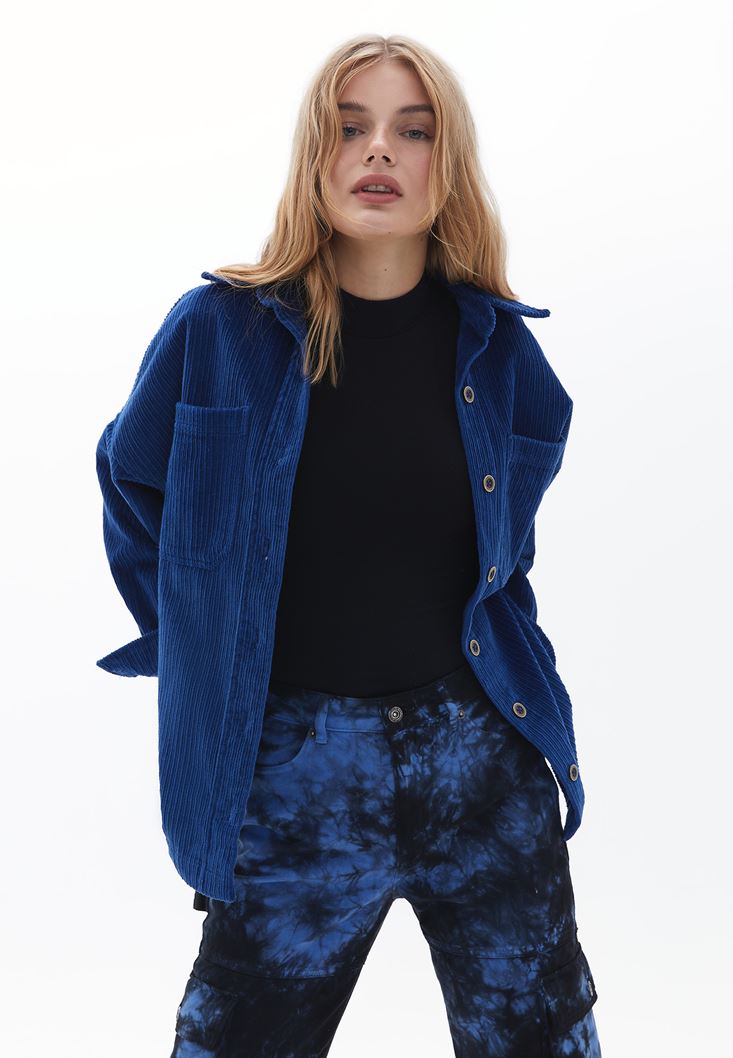 %100 pamuk içerikli, fitilli kadife doku, ön kısmı iki cepli, bedenden uzak oversize fit, uzun kollu.