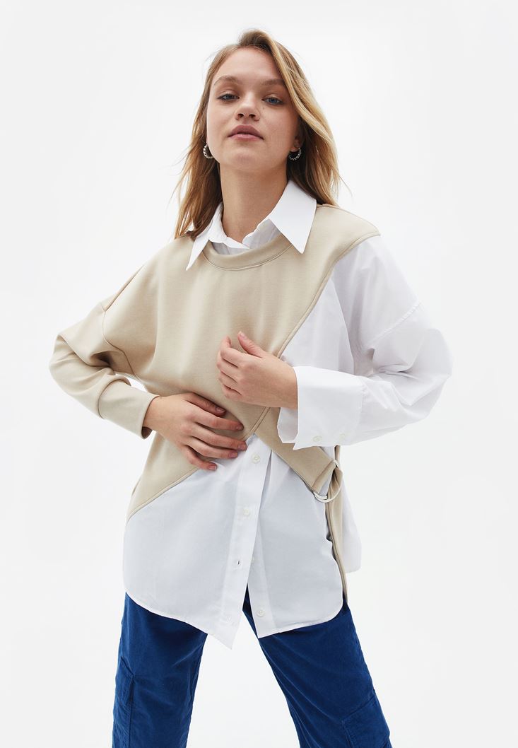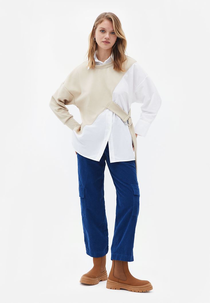 Pamuk karışımlı özel doku, gömlek ve sweat birleşimli tasarım, uzun kollu, yan kısmı kemer detaylı, bedenden uzak oversize fit.