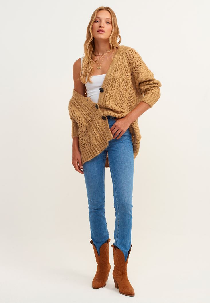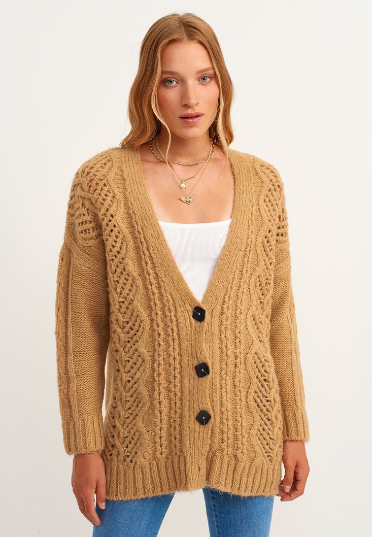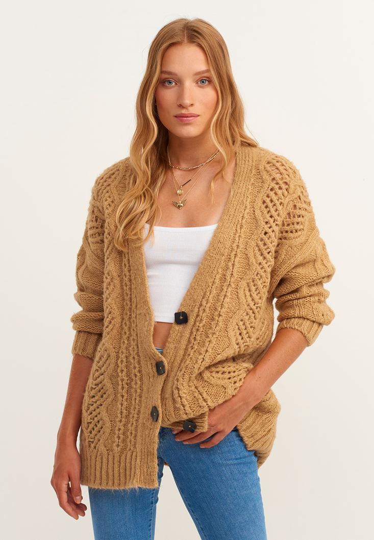 Örgü detaylı tasarım, V yaka, düğme kapamalı, midi boy, yumuşak doku, bedenden uzak rahat fit.