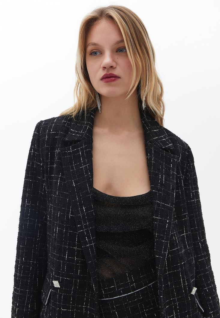 Pamuk karışımlı ışıltılı doku, içi astarlı, bedenden uzak oversize fit, kapaklı cep tasarımı, taş detaylı düğme, omuzları vatkalı.