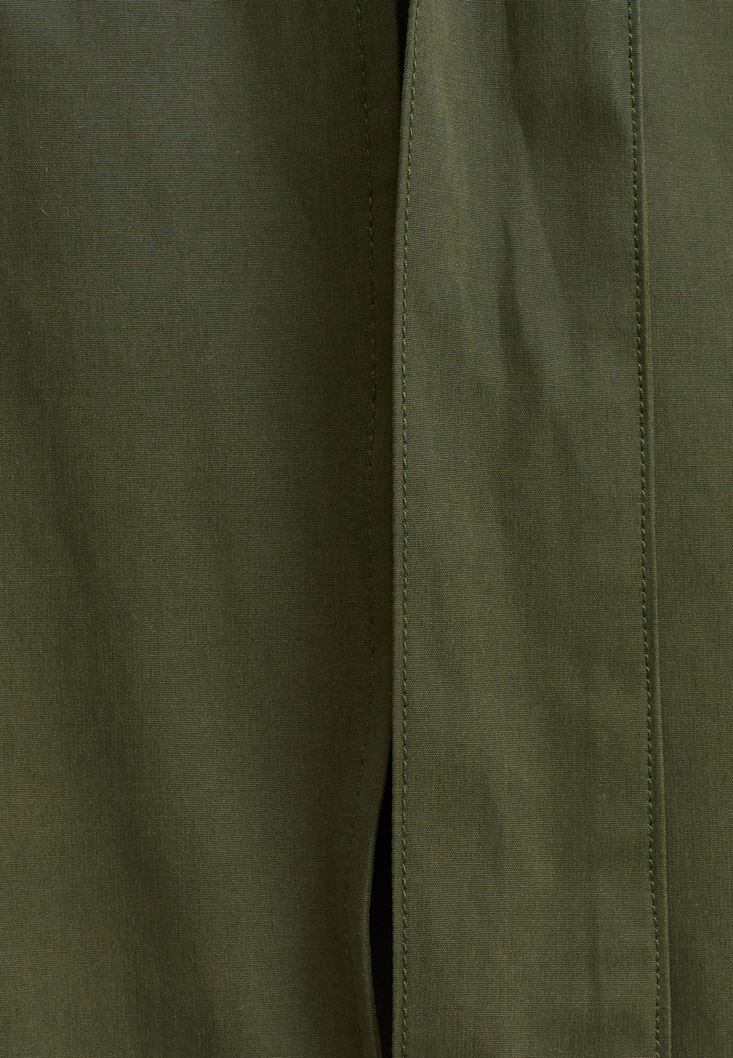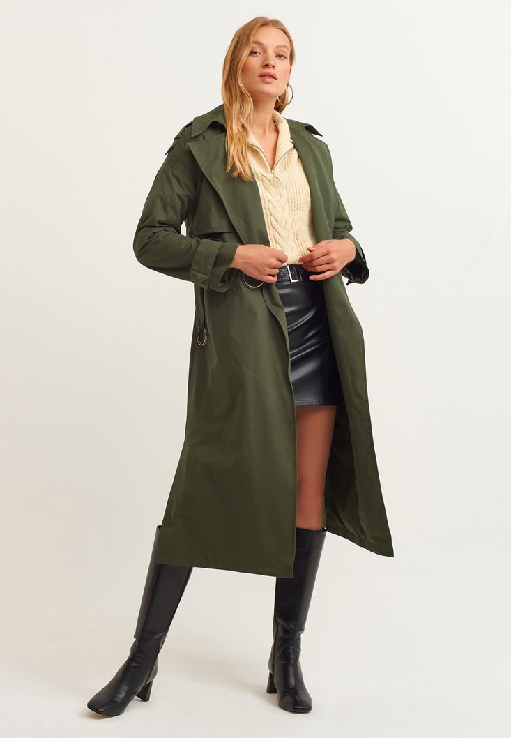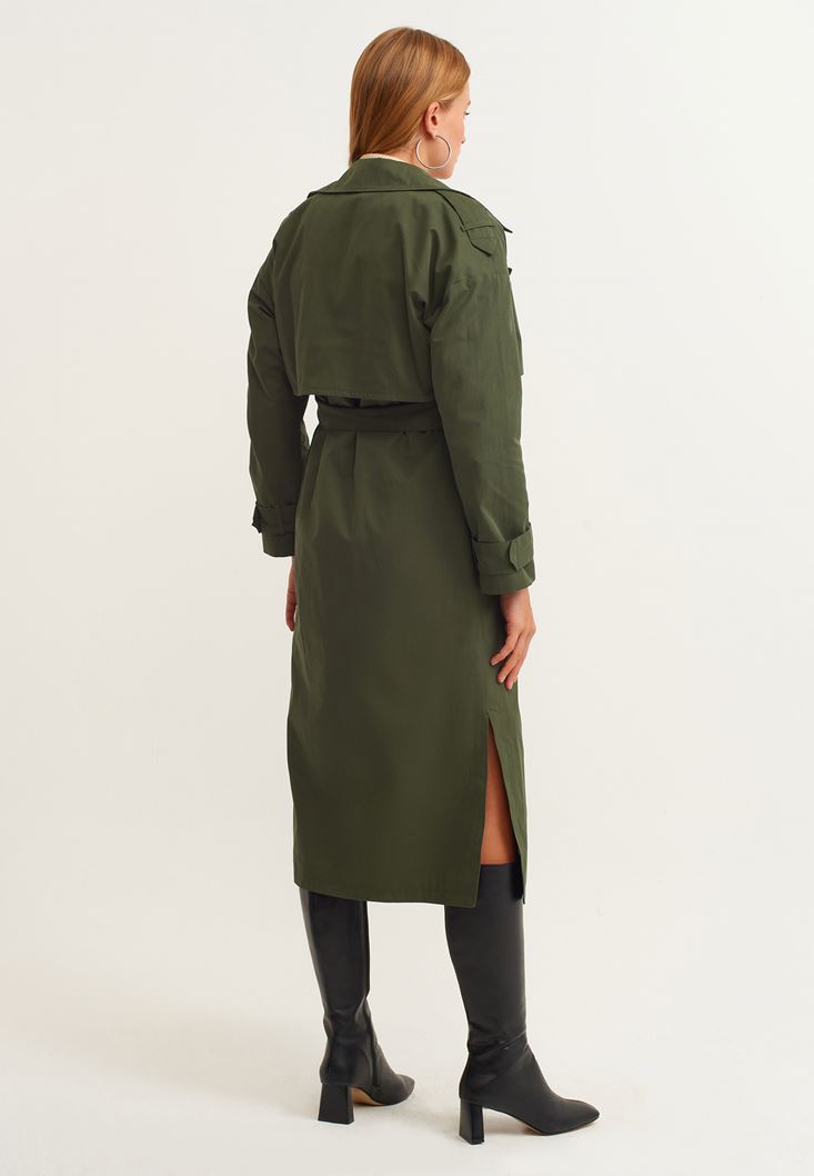 Pamuk karışımlı özel doku, kendi kumaşından kemerli, iki cepli, bedenden uzak oversize fit, iki yanı yırtmaçlı, omuz ve kol ucu apoletli, ön ve arka kısmı rüzgarlık detaylı.