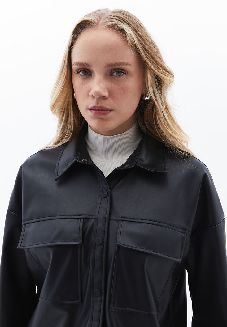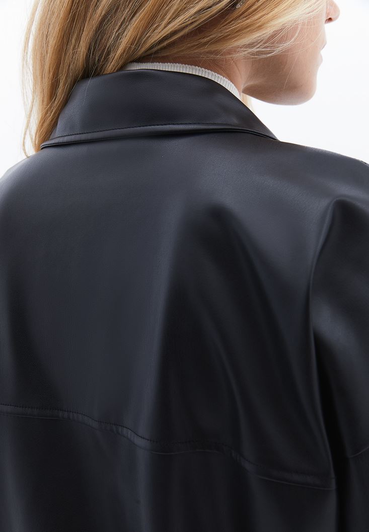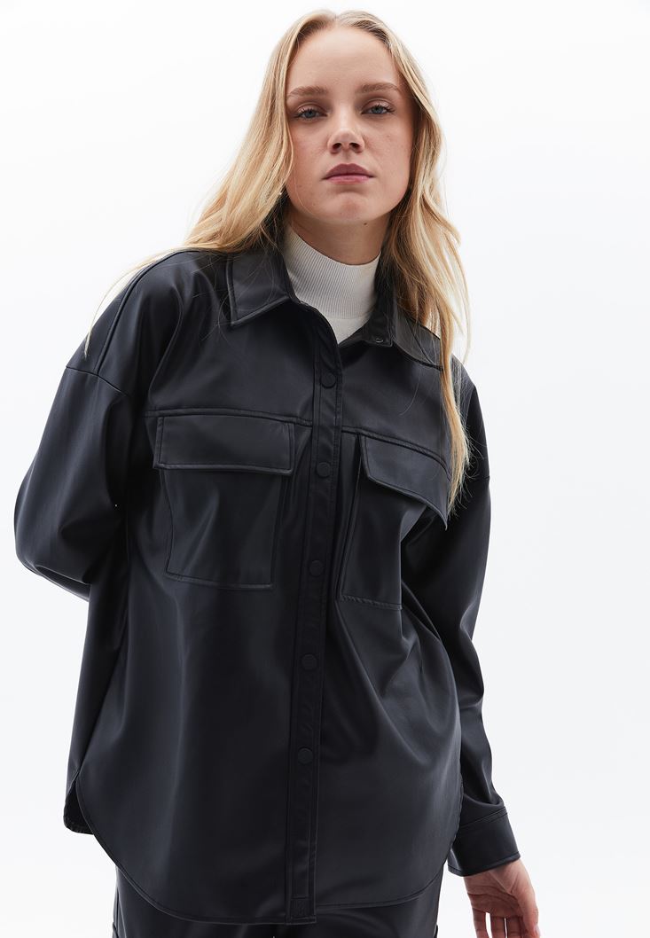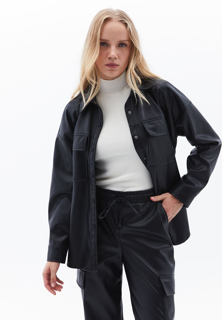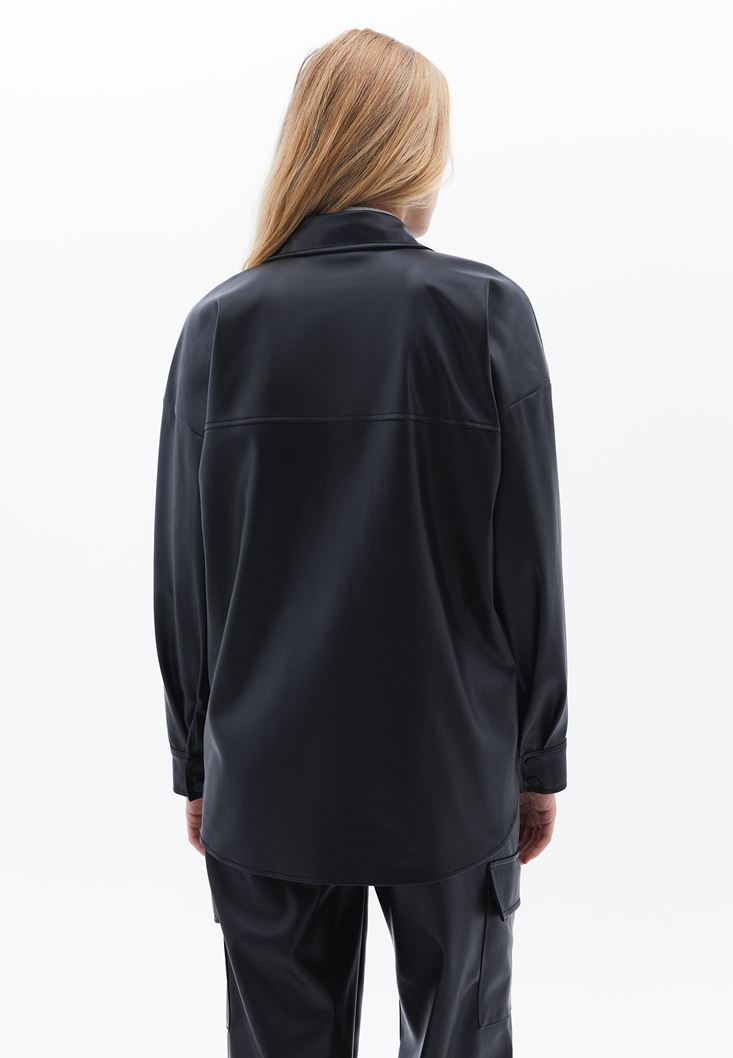• Bayan Siyah Oversize Vegan Deri Gömlek