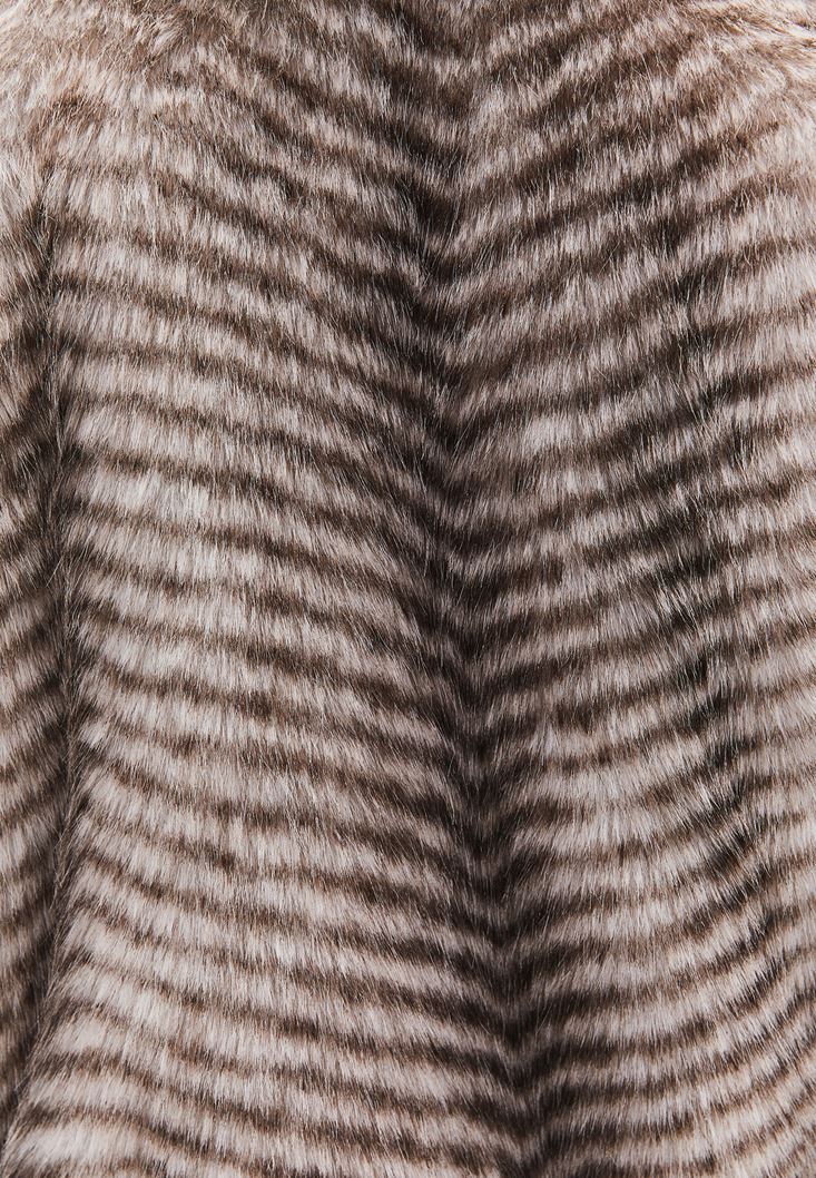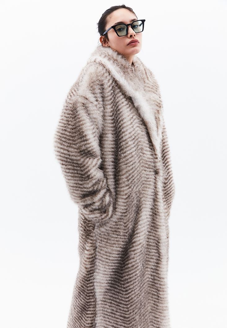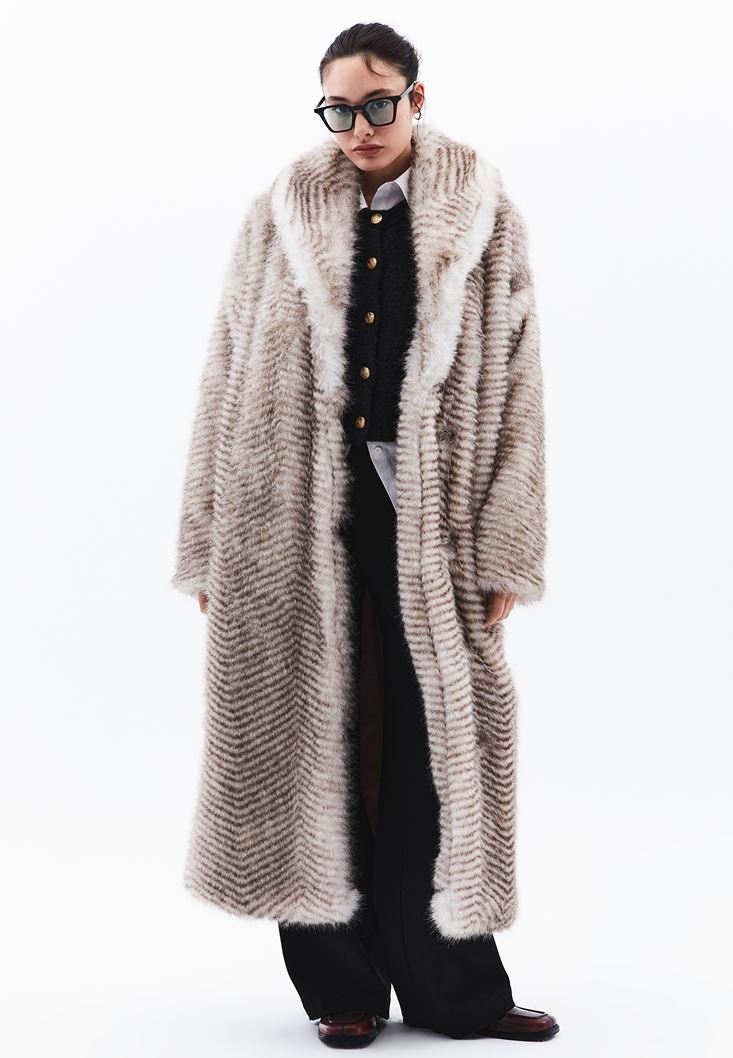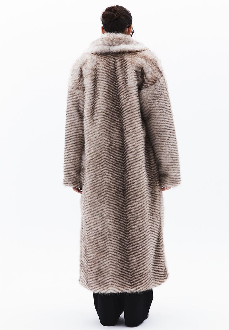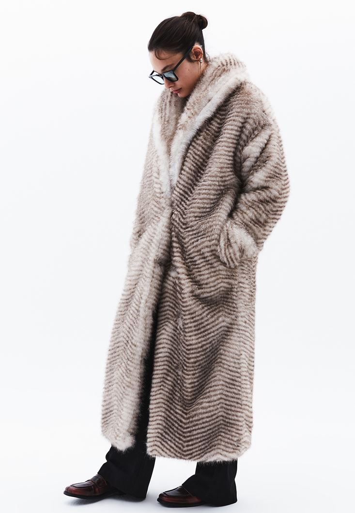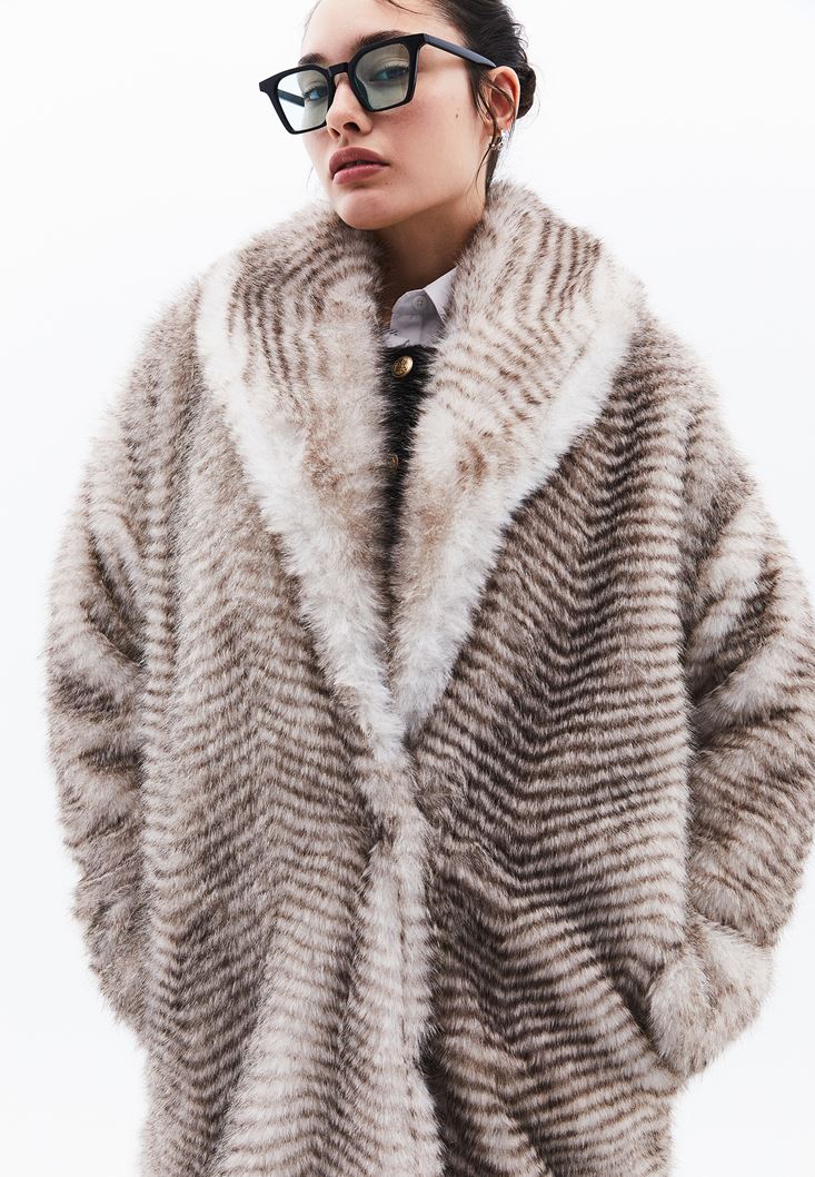 Desenli vegan kürk doku, içi astarlı, bedenden uzak oversize fit, çıtçıt kapamalı, şal yaka, iki cepli, uzun kesim.