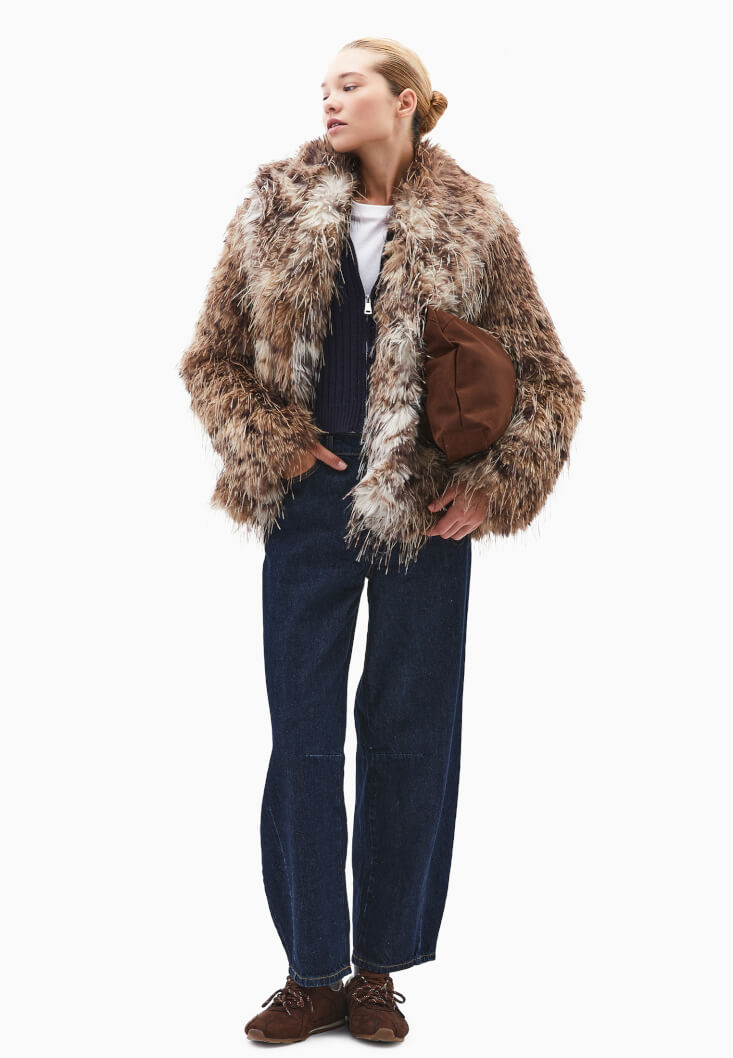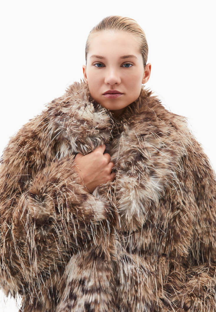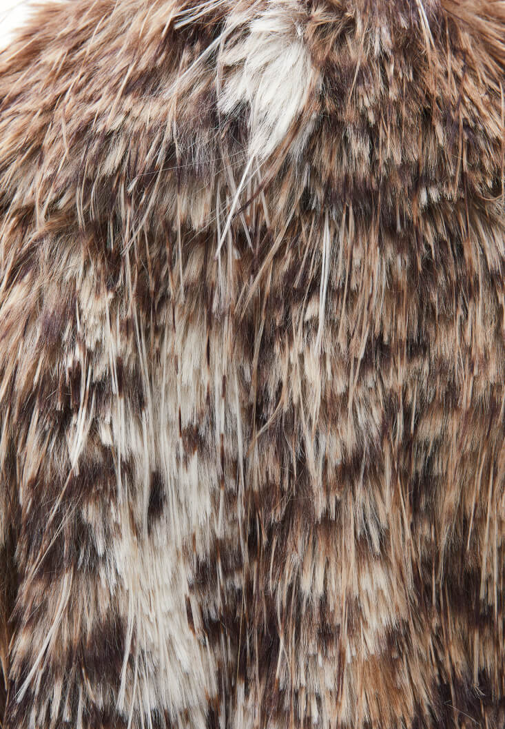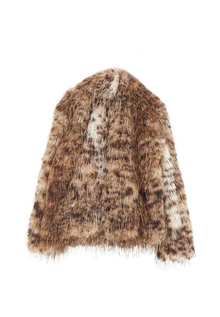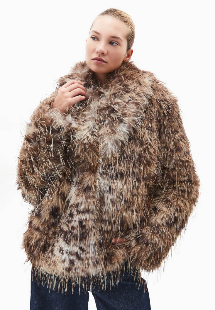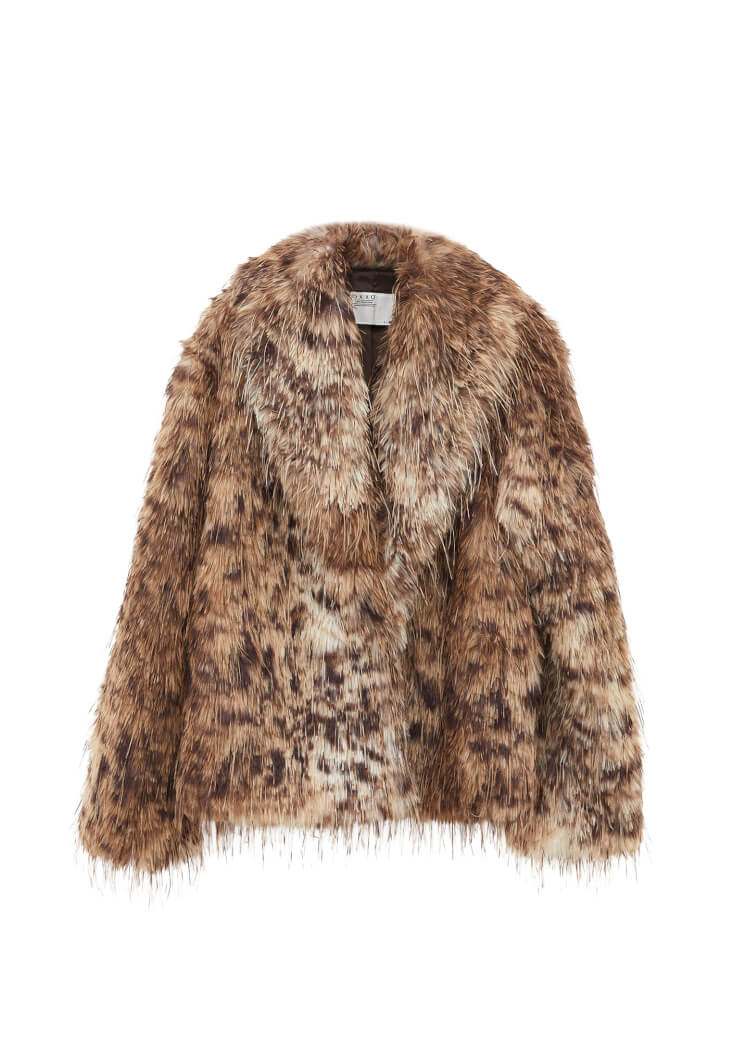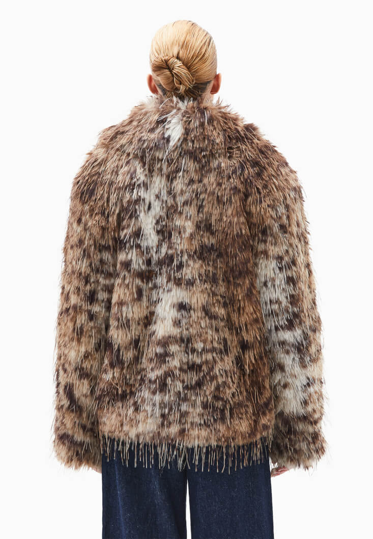 Vegan kürk doku, desenli görünüm, bedenden uzak oversize fit, uzun kollu, içi astarlı, şal yaka, çıtçıt kapamalı.