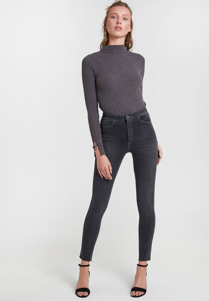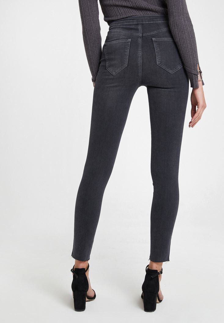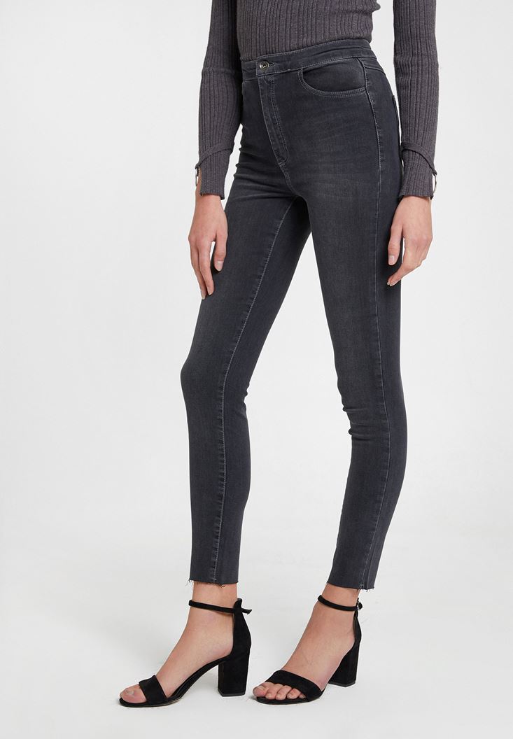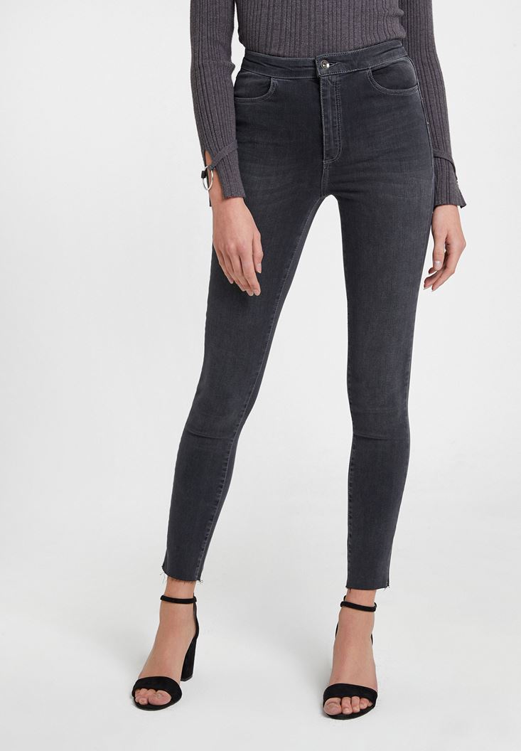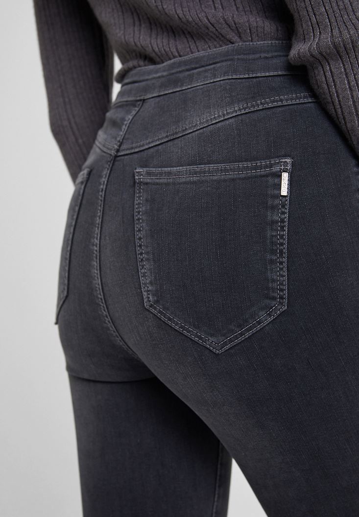 Gri Paça Detaylı Ultra Yüksel Bel Denim Pantolon