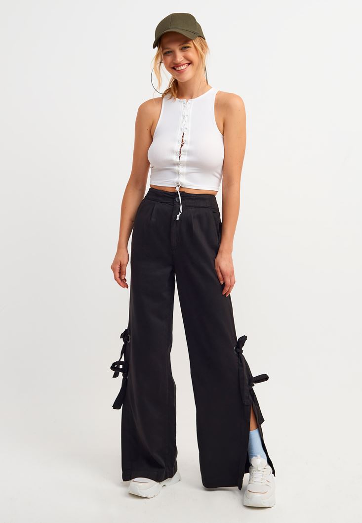 Geri dönüştürülebilir Tencel(Lyocell) ve pamuk karışımlı doğa dostu doku, ultra yüksek bel, bol paça, yırtmaçlı ve yırtmaç kısmı bağcık detaylı, bel kısmı pileli, önü iki cepli.