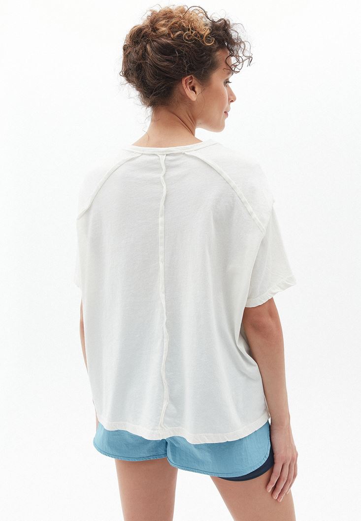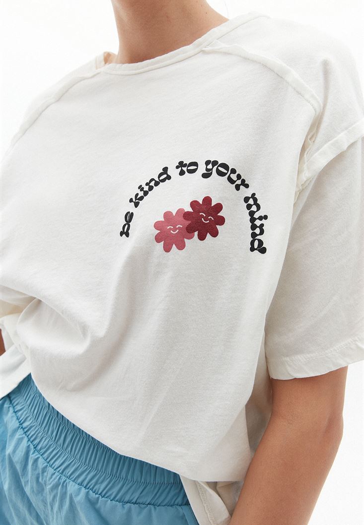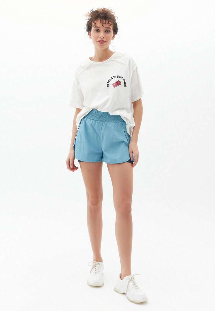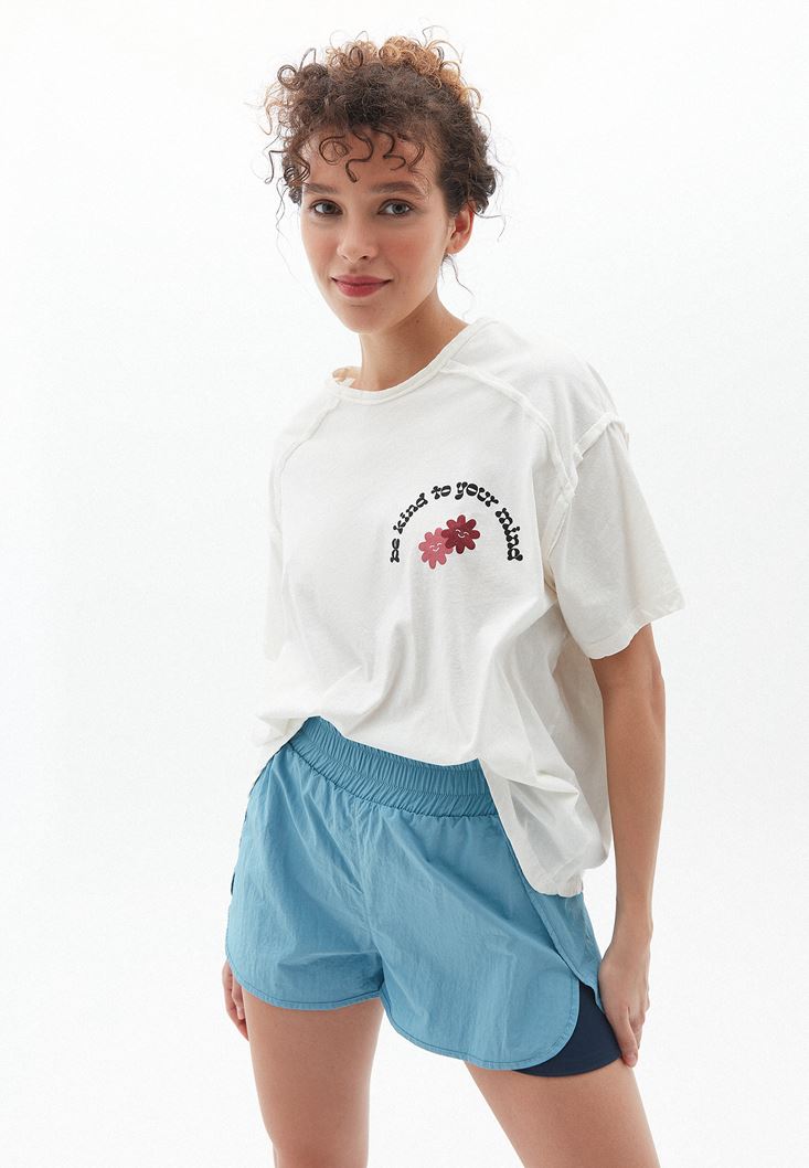 %100 pamuklu doğal doku, sıfır yaka, kısa kollu, ön kısmı baskı ve slogan detaylı, bedenden uzak rahat fit, standart boy, omuz ve sırt kısmı dikiş detaylı.