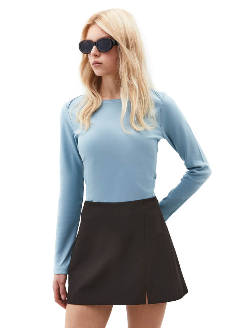 %100 pamuk içerikli doğal doku, bot yaka, uzun kollu, bedeni saran esnek fit.