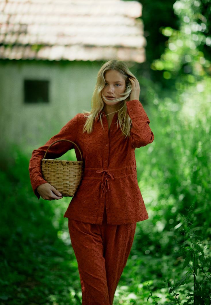 %100 pamuklu doğal içerik, bedenden uzak rahat fit, uzun kollu, beli çift bağcıklı, düğme kapamalı, nakışlı brode doku