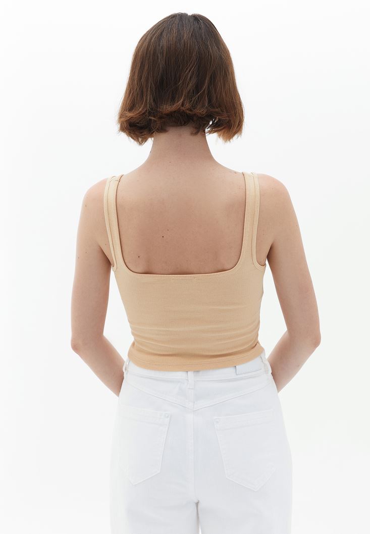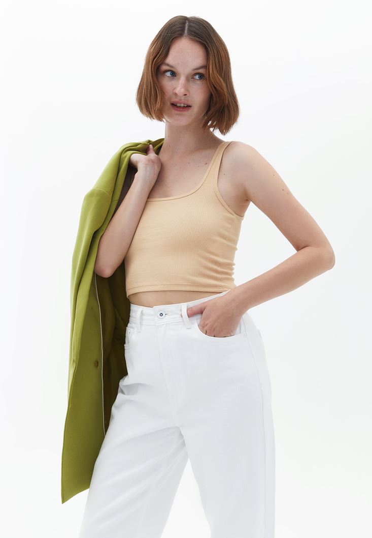 Pamuklu esnek doku, bedeni saran fit, fitilli doku, kare yaka, kalın askılı, sırt kısmı kare kesim, crop kesim.