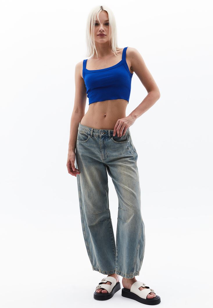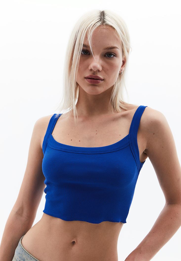 Pamuk içerikli esnek doku, ince askılı, kare yaka, crop kesim, jakarlı doku, bedeni saran fit.