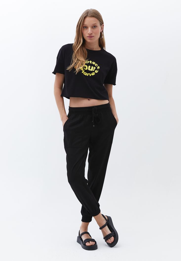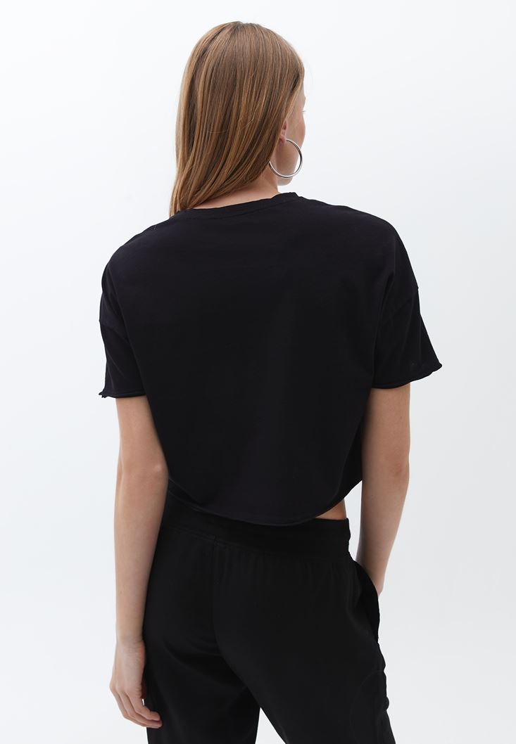 %100 pamuklu doğal doku, crop kesim, kısa kollu, sıfır yaka, önü slogan baskılı, bedenden uzak fit.