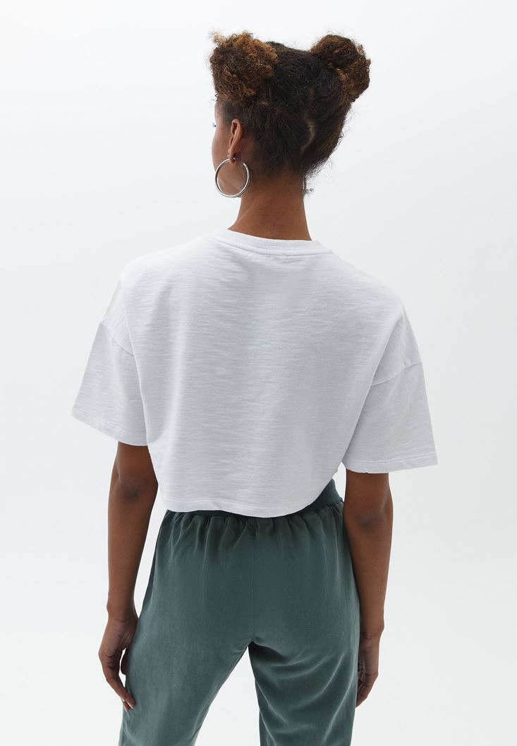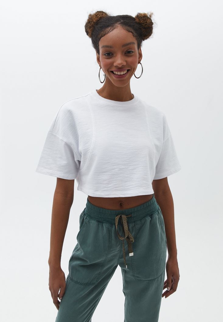 %100 pamuklu doku, sıfır yaka, crop kesim, kısa kollu, bedenden uzak rahat fit.