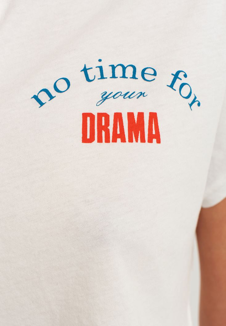 %100 pamuklu doğal doku, crop kesim, kısa kollu, V yaka, ön kısmı baskı detaylı, bedenden uzak rahat fit.