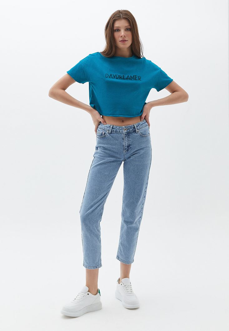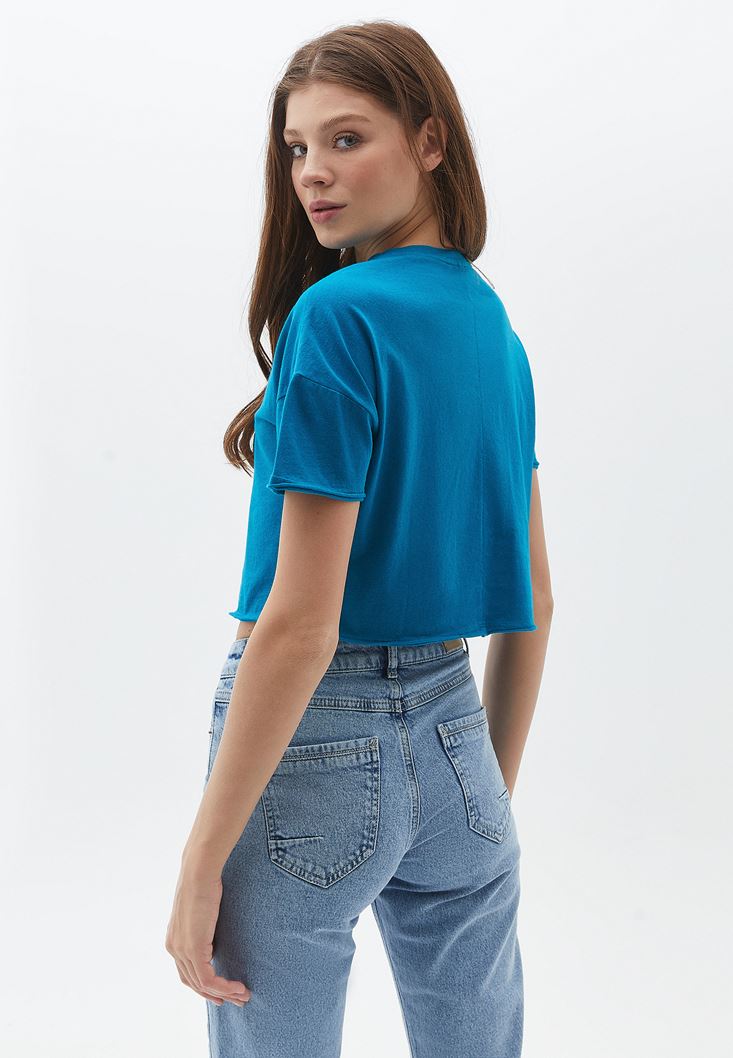 %100 pamuklu doğal doku, crop kesim, ön kısmı slogan detaylı, kısa kollu, sıfır yaka, bedenden uzak rahat fit.
