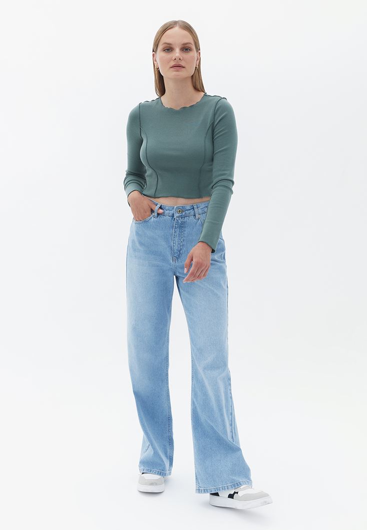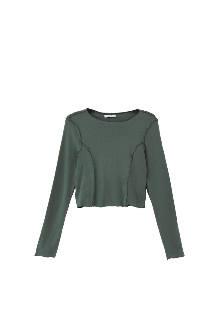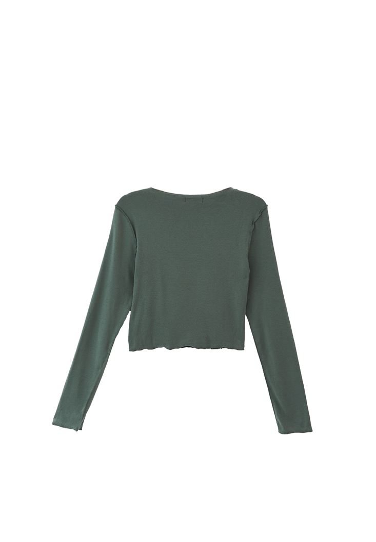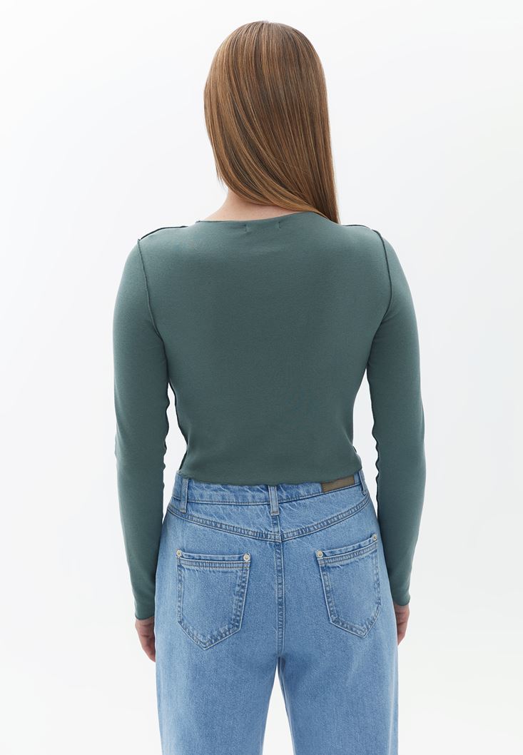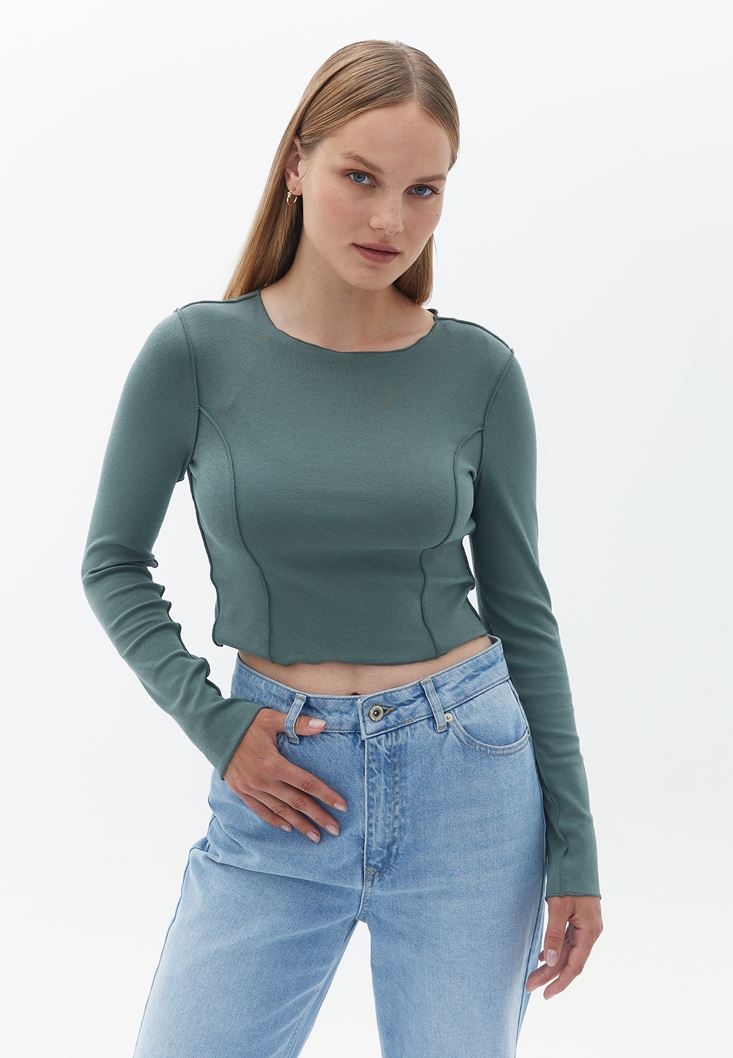 Pamuk karışımlı doku, bedeni saran esnek fit, uzun kollu, sıfır yaka, crop kesim.