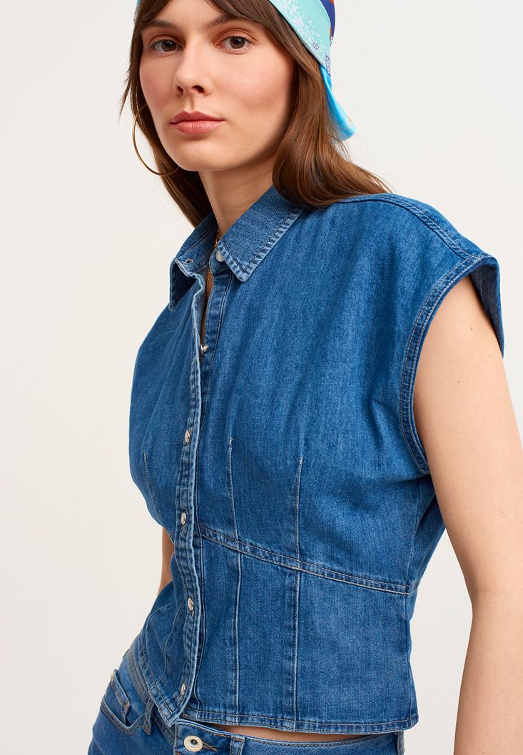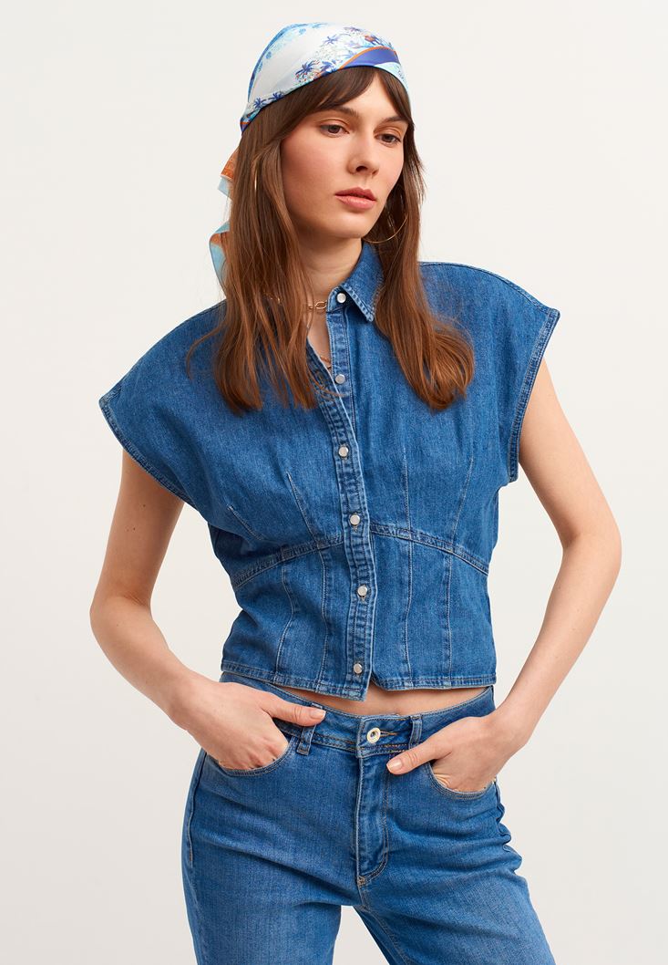 • Bayan Mavi Pamuklu Denim Crop Gömlek