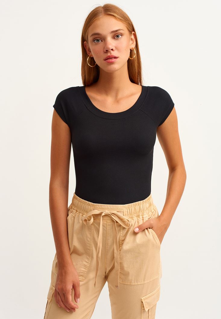 • Bayan Siyah Pamuklu Esnek Dokulu Tişört