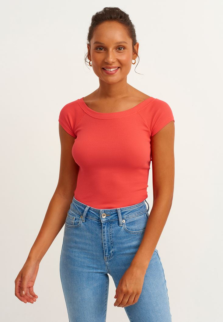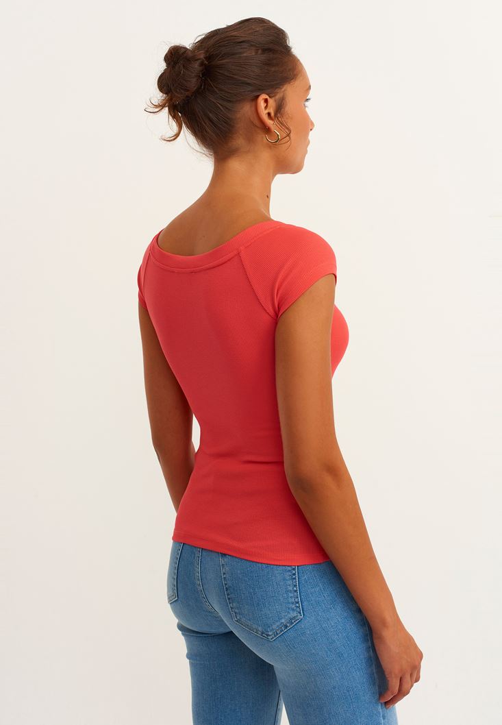 • Bayan Kırmızı Pamuklu Esnek Dokulu Tişört