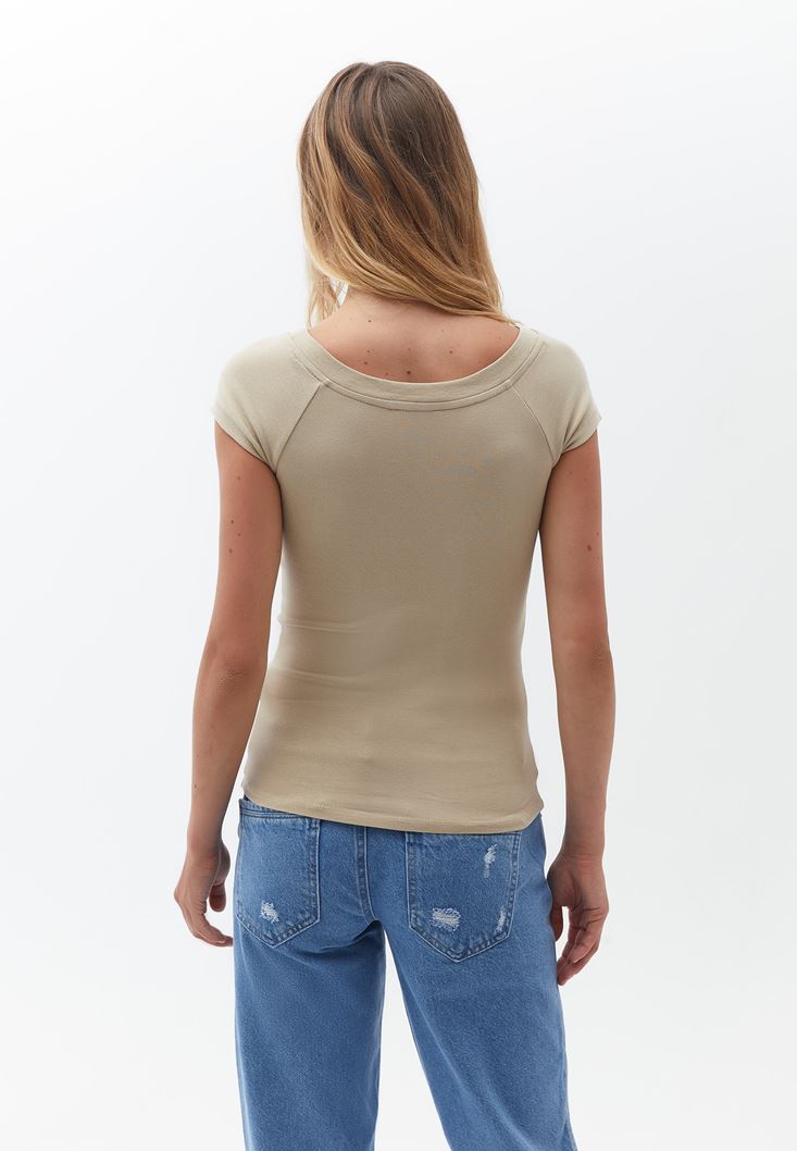 Pamuklu fitilli doku, bedeni saran esnek fit, kısa kollu, standart boy, bot yaka.
