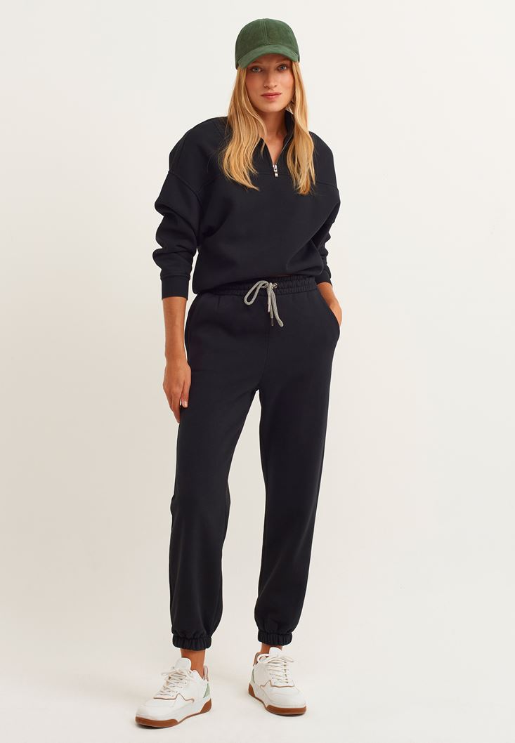 Pamuk karışımlı yumuşak sweat doku, fermuarlı yüksek yaka, üst kısmı dikiş detaylı, uzun kollu, kol ucu ve bel kısmı jakarlı, bedene yakın rahat kalıp.