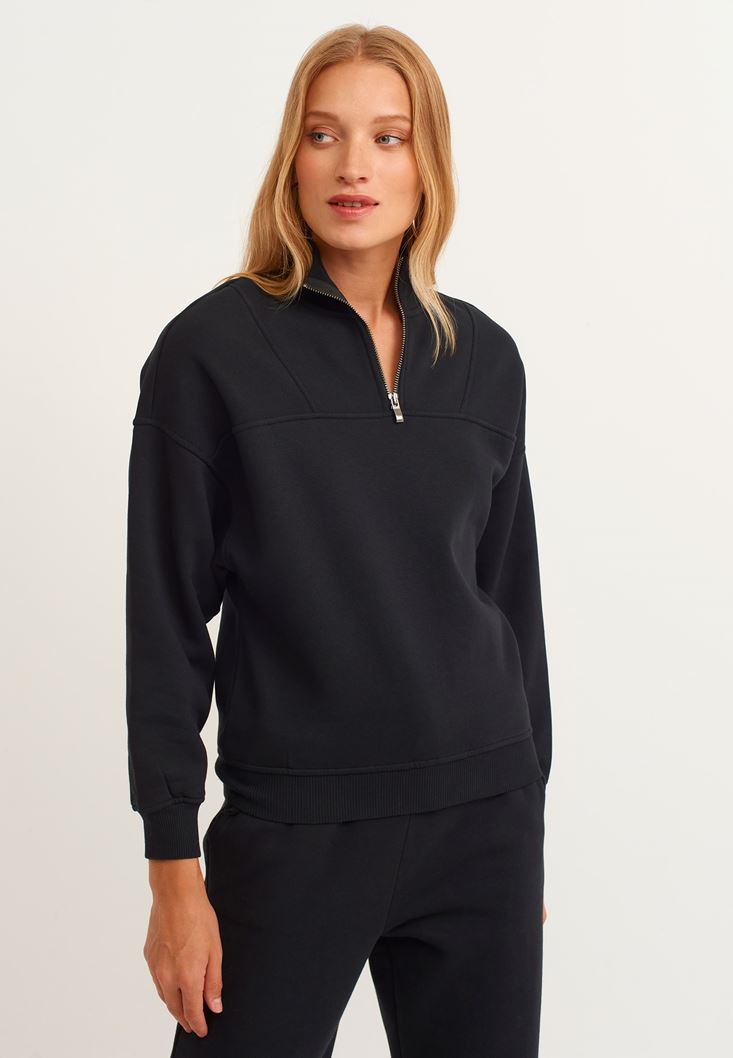 • Bayan Siyah Pamuklu Fermuar Detaylı Sweatshirt