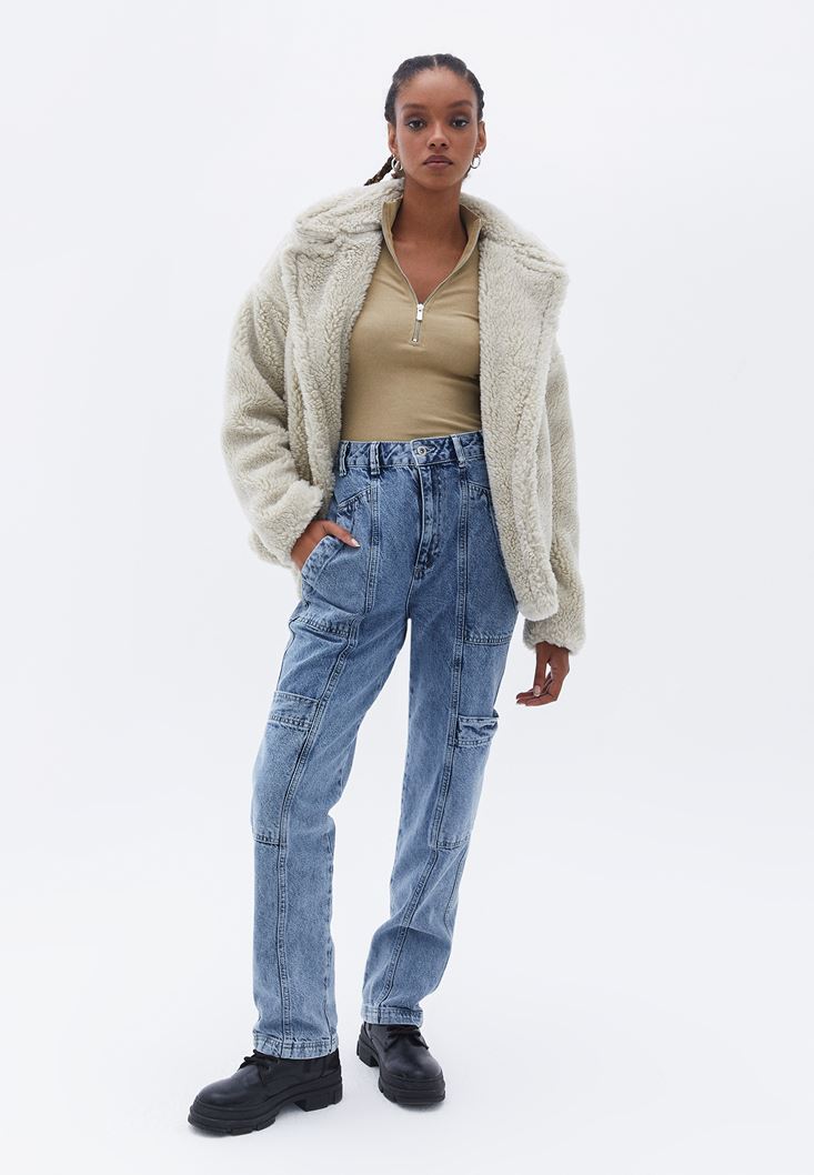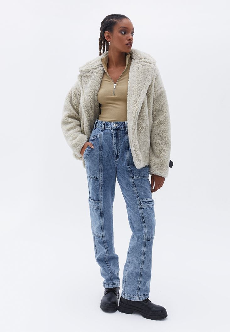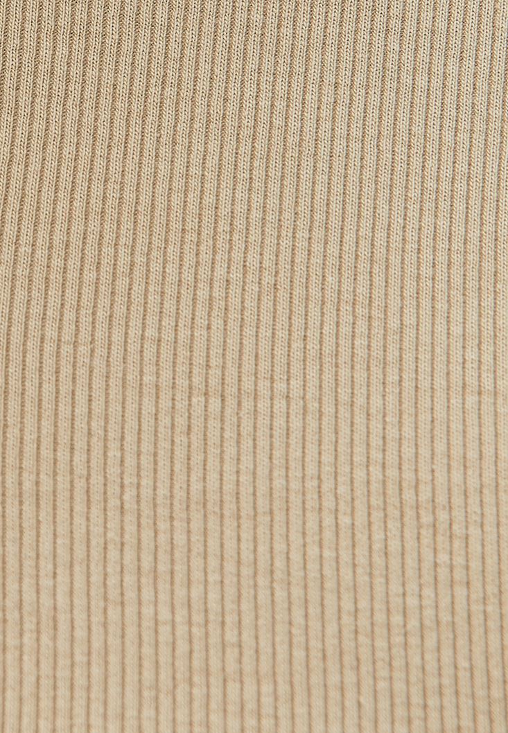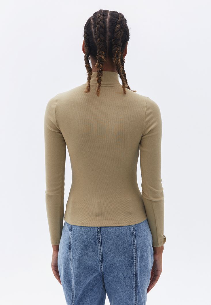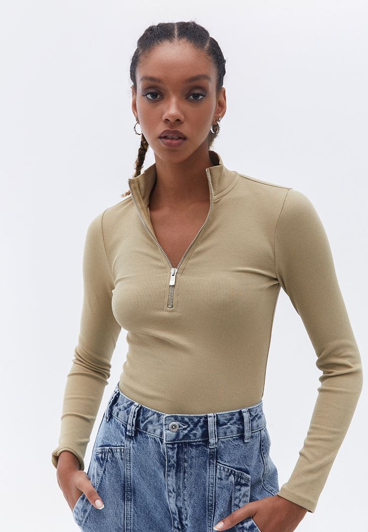 Bej Pamuklu Fermuar Detaylı Tişört