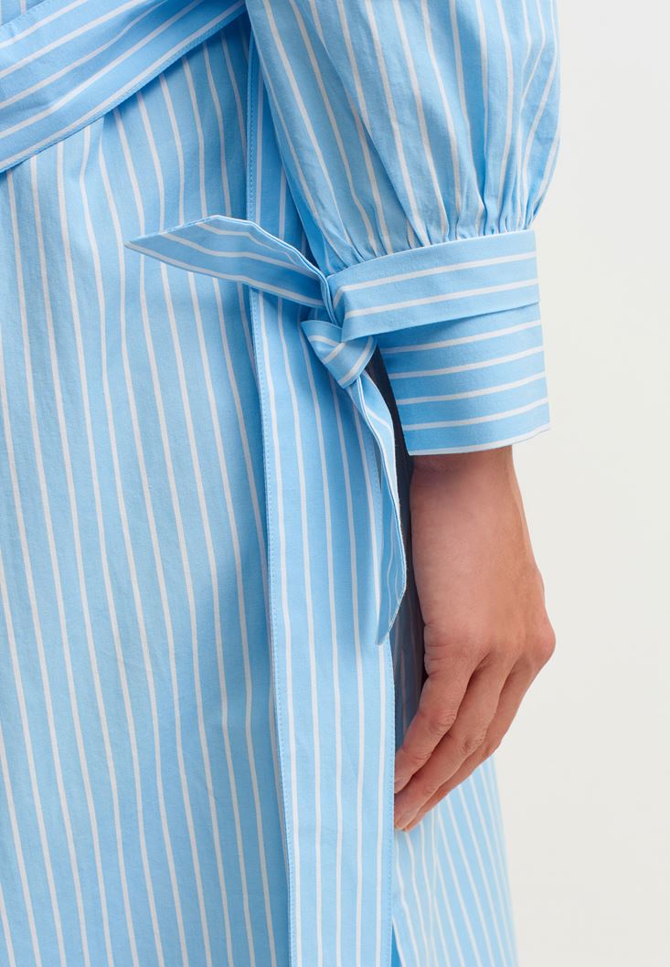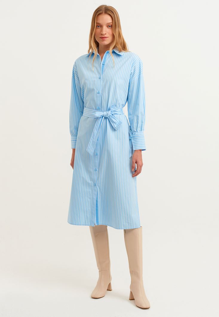 %100 pamuklu doku, çizgi desenli, bedenden uzak rahat fit, uzun kollu, midi boy, kendi kumaşından kuşaklı, bağcıklı manşet detaylı.