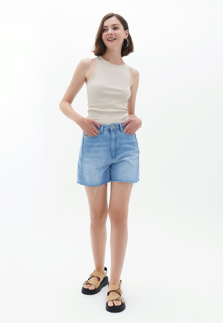 Pamuk karışımlı fitilli doku, bedeni saran esnek fit, halter yaka, crop kesim.