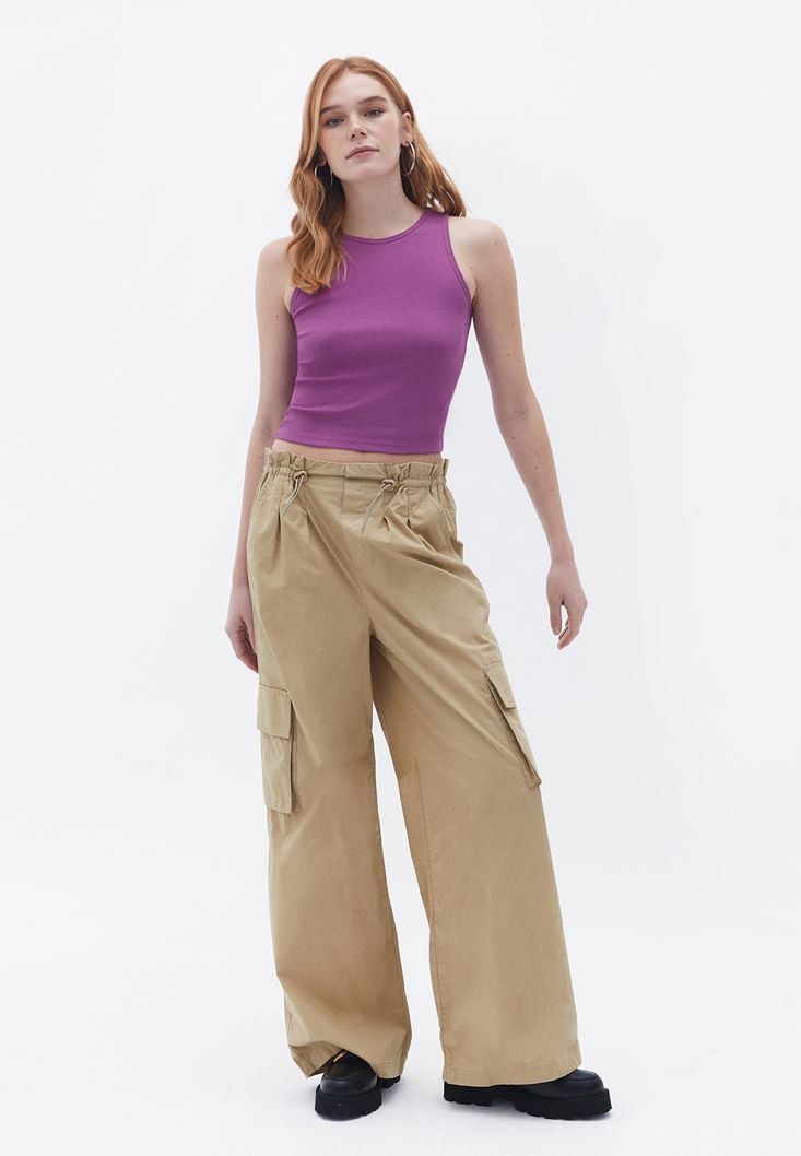 Pamuk karışımlı fitilli doku, bedeni saran esnek fit, halter yaka, crop kesim.