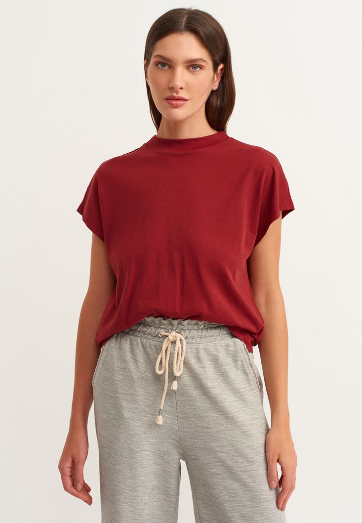 • Bayan Bordo Pamuklu High-Neck Tişört