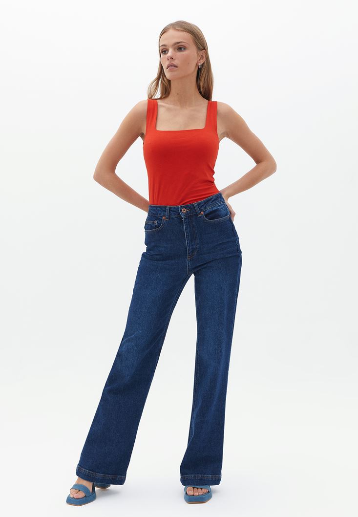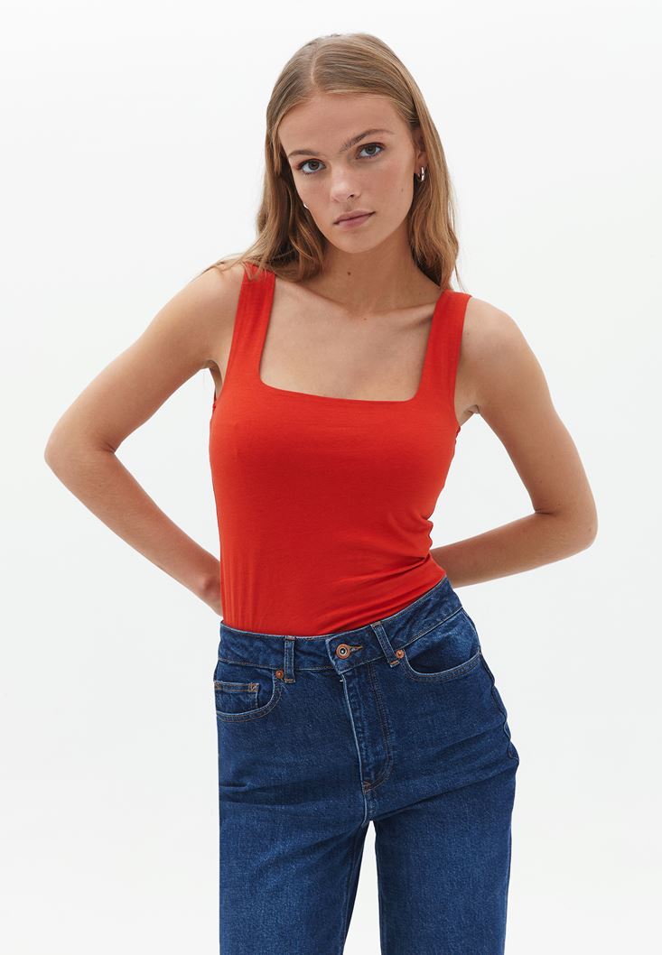 Pamuk içerikli doku, bedeni saran esnek fit, kare yaka, kalın askılı.