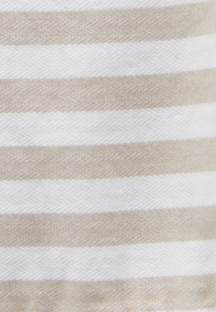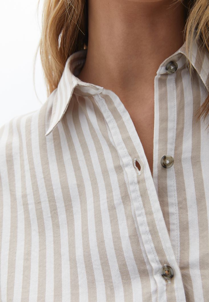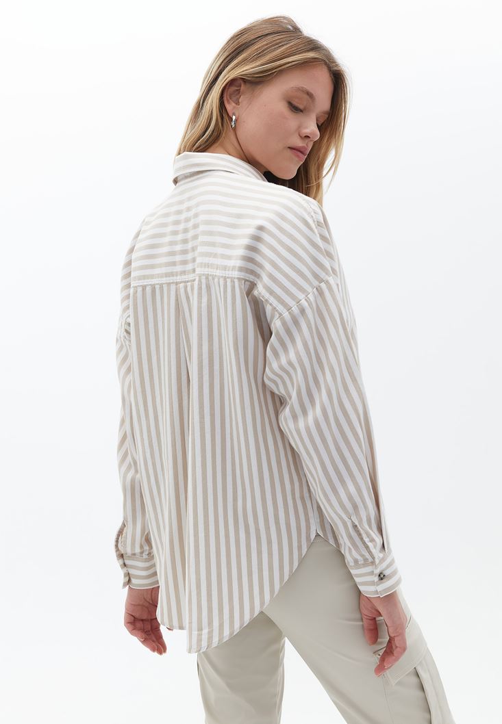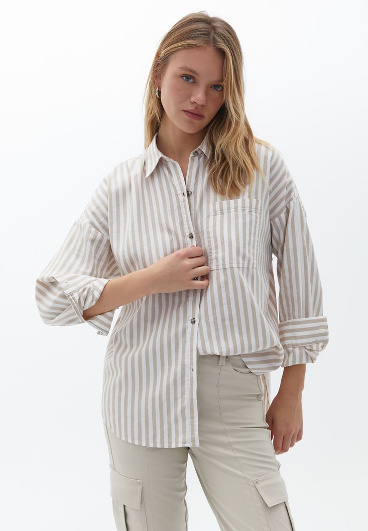 %100 pamuklu doğal, çizgi desenli, bedenden uzak oversize fit, önü kısa arkası uzun asimetrik kesim, uzun kollu, üst kısmı tek cepli.